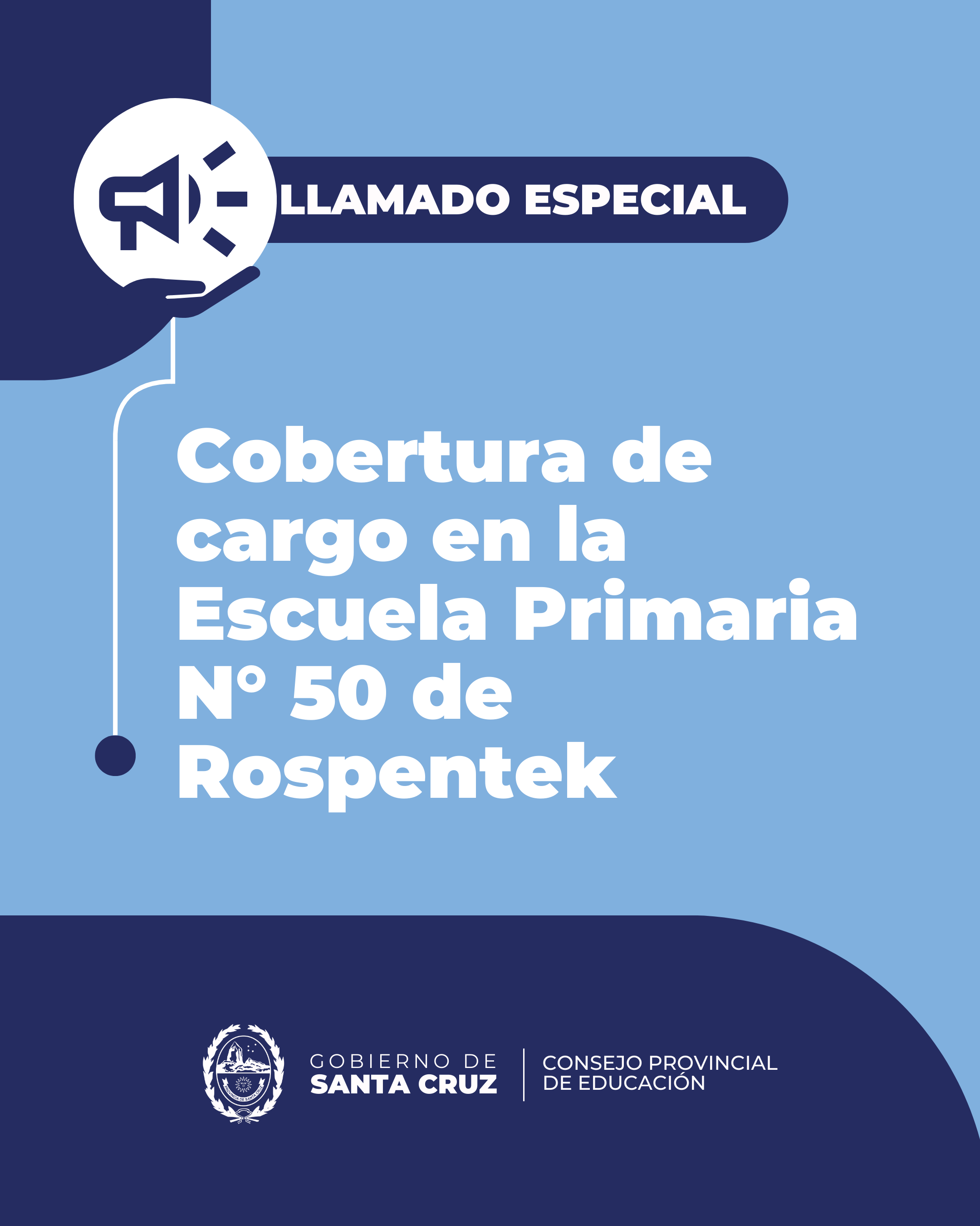 Llamado Especial para cubrir cargo en la Escuela Provincial Primaria N° 50 de Rospentek El Consejo Provincial de Educación, la Junta de Clasificación Primaria, informa que se encuentra a disposición…