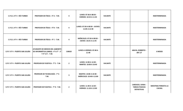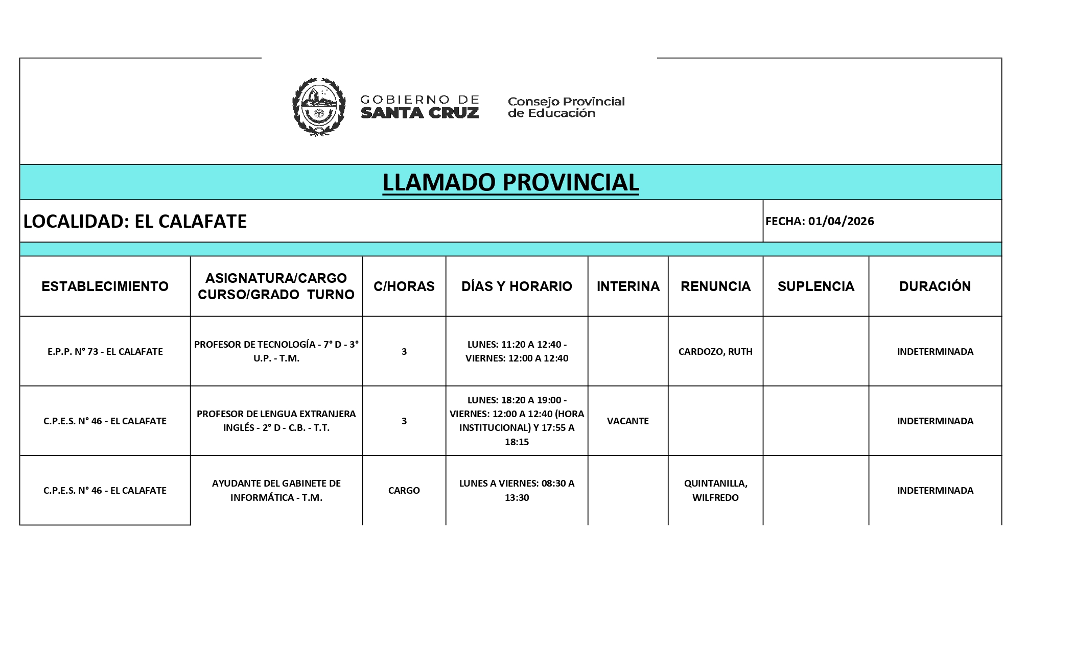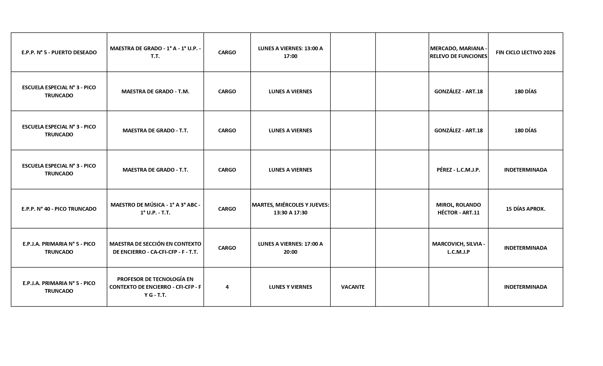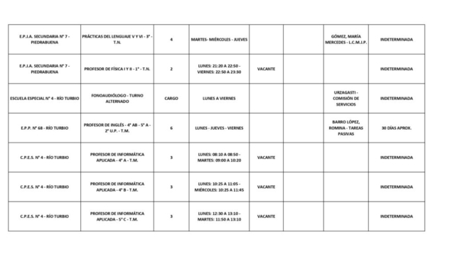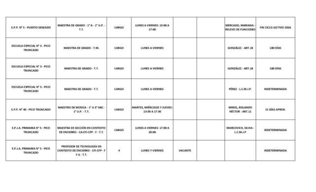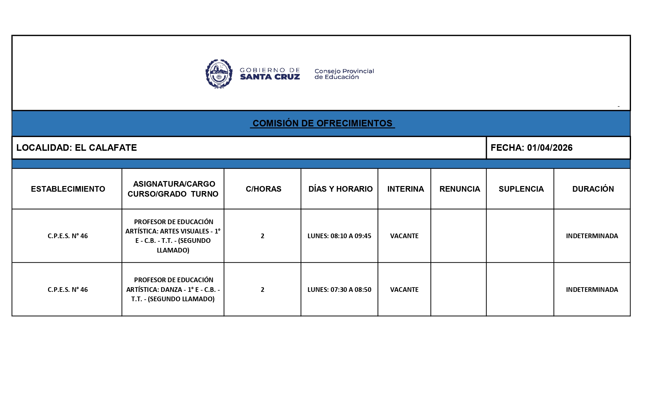 01/04/2026 | El Consejo Provincial de Educación, a través de las Comisiones de Ofrecimientos, informa que se encuentran disponibles los listados para acceder a los cargos y horas cátedra en establecimientos de diferentes localidades. Los mismos se realizarán de manera presencial.