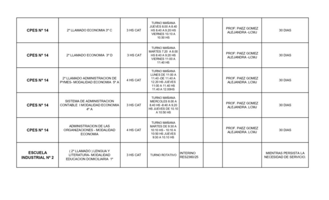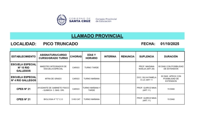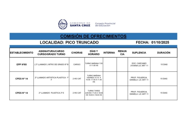 01/10/2025 | El Consejo Provincial de Educación, a través de las Comisiones de Ofrecimientos, informa que se encuentran disponibles los listados para acceder a los cargos y horas cátedra en establecimientos de diferentes localidades. Los mismos se realizarán de manera presencial.