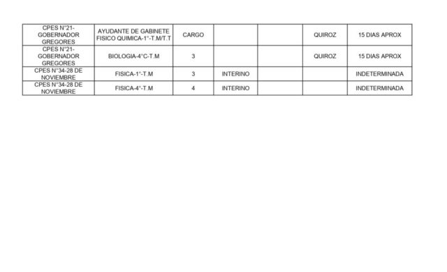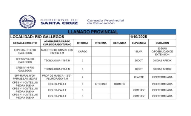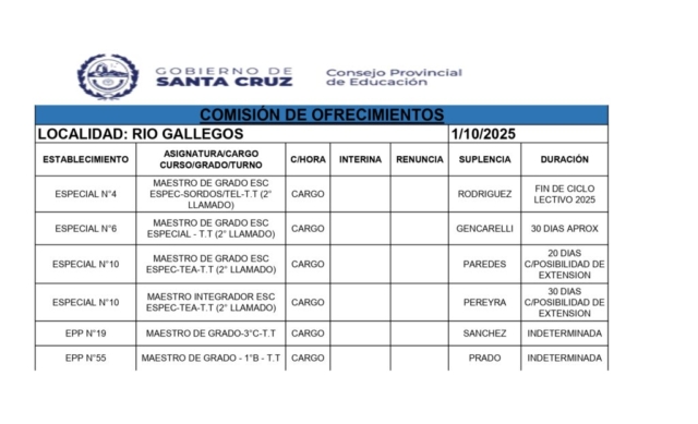 01/10/2025 | El Consejo Provincial de Educación, a través de las Comisiones de Ofrecimientos, informa que se encuentran disponibles los listados para acceder a los cargos y horas cátedra en establecimientos de diferentes localidades. Los mismos se realizarán de manera presencial.