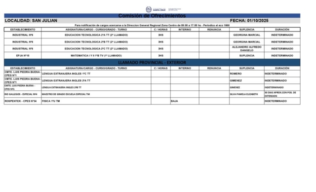 01/10/2025 | El Consejo Provincial de Educación, a través de las Comisiones de Ofrecimientos, informa que se encuentran disponibles los listados para acceder a los cargos y horas cátedra en establecimientos de diferentes localidades. Los mismos se realizarán de manera presencial.
