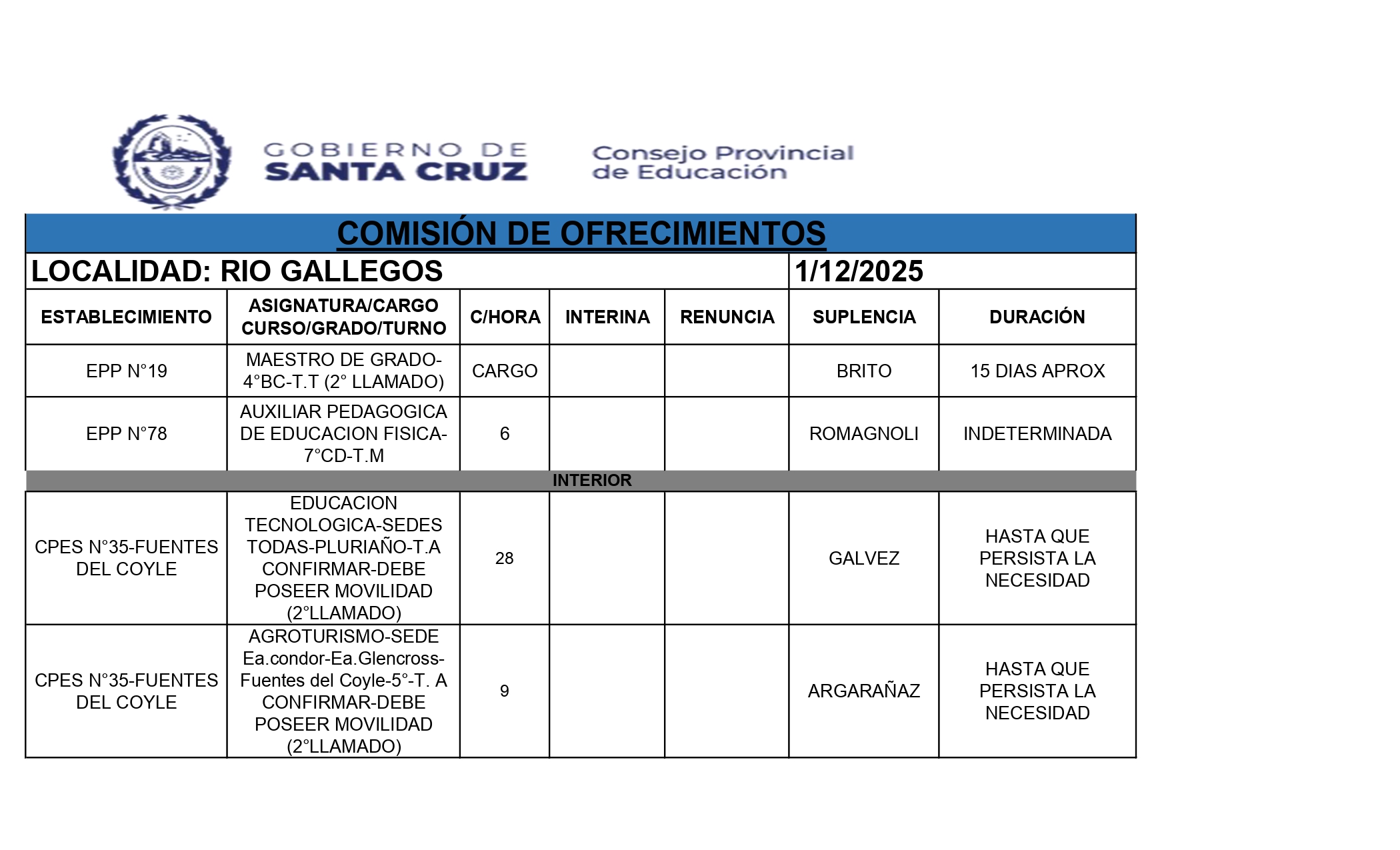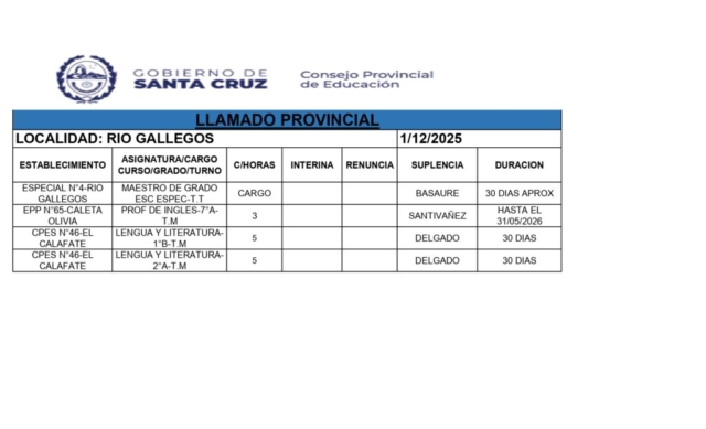 01/12/2025 | El Consejo Provincial de Educación, a través de las Comisiones de Ofrecimientos, informa que se encuentran disponibles los listados para acceder a los cargos y horas cátedra en establecimientos de diferentes localidades. Los mismos se realizarán de manera presencial.