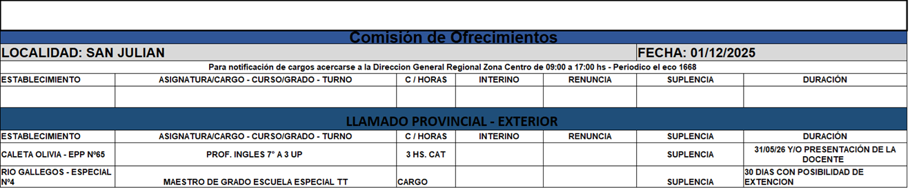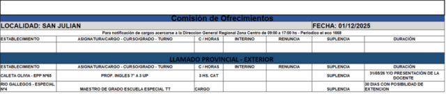 01/12/2025 | El Consejo Provincial de Educación, a través de las Comisiones de Ofrecimientos, informa que se encuentran disponibles los listados para acceder a los cargos y horas cátedra en establecimientos de diferentes localidades. Los mismos se realizarán de manera presencial.