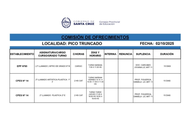 02/10/2025 | El Consejo Provincial de Educación, a través de las Comisiones de Ofrecimientos, informa que se encuentran disponibles los listados para acceder a los cargos y horas cátedra en establecimientos de diferentes localidades. Los mismos se realizarán de manera presencial.