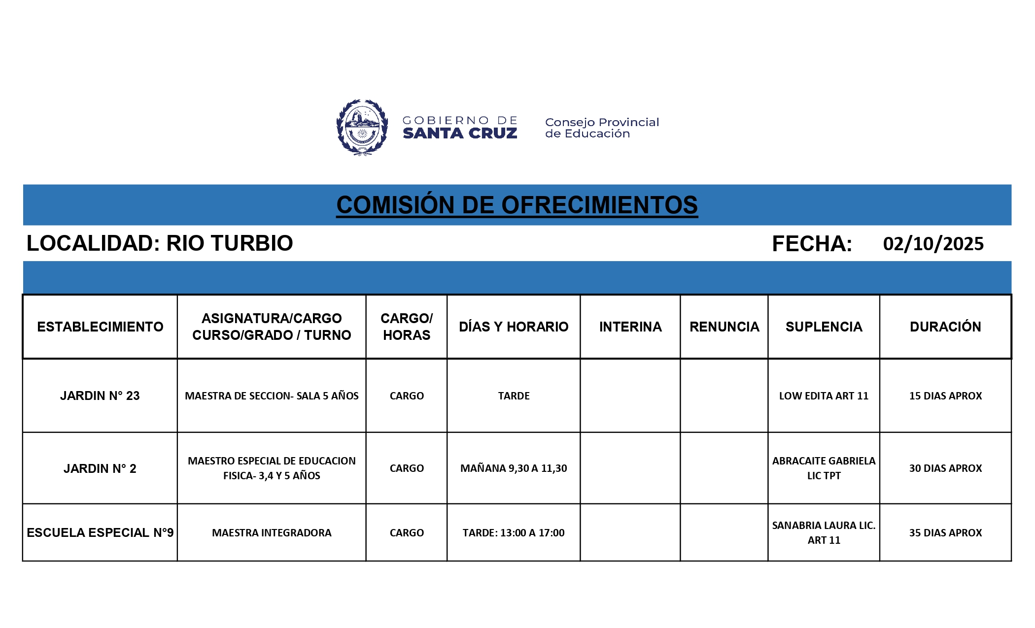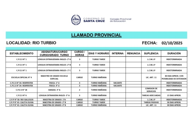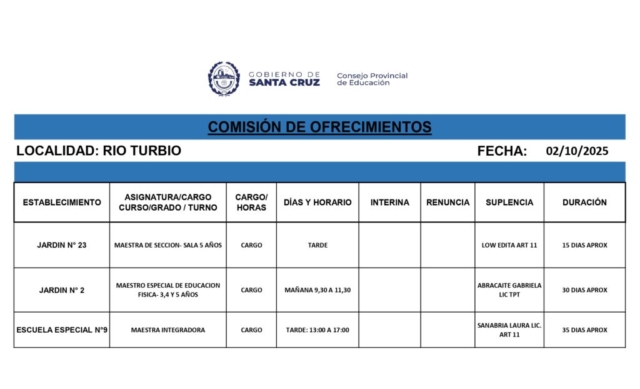 02/10/2025 | El Consejo Provincial de Educación, a través de las Comisiones de Ofrecimientos, informa que se encuentran disponibles los listados para acceder a los cargos y horas cátedra en establecimientos de diferentes localidades. Los mismos se realizarán de manera presencial.