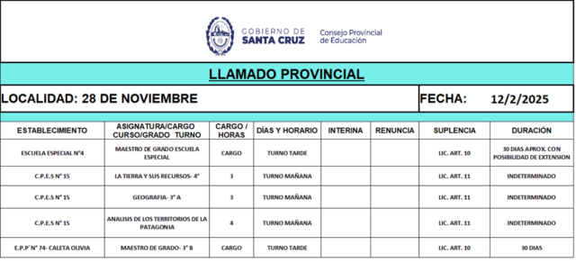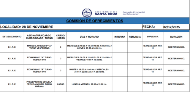 02/12/2025 | El Consejo Provincial de Educación, a través de las Comisiones de Ofrecimientos, informa que se encuentran disponibles los listados para acceder a los cargos y horas cátedra en establecimientos de diferentes localidades. Los mismos se realizarán de manera presencial.
