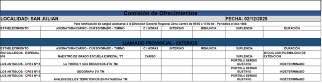 02/12/2025 | El Consejo Provincial de Educación, a través de las Comisiones de Ofrecimientos, informa que se encuentran disponibles los listados para acceder a los cargos y horas cátedra en establecimientos de diferentes localidades. Los mismos se realizarán de manera presencial.