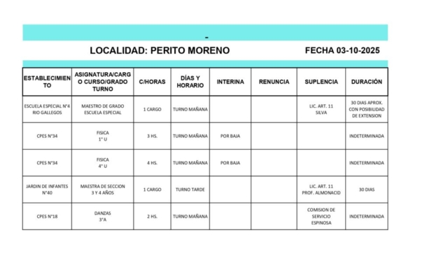 03/10/2025 | El Consejo Provincial de Educación, a través de las Comisiones de Ofrecimientos, informa que se encuentran disponibles los listados para acceder a los cargos y horas cátedra en establecimientos de diferentes localidades. Los mismos se realizarán de manera presencial.