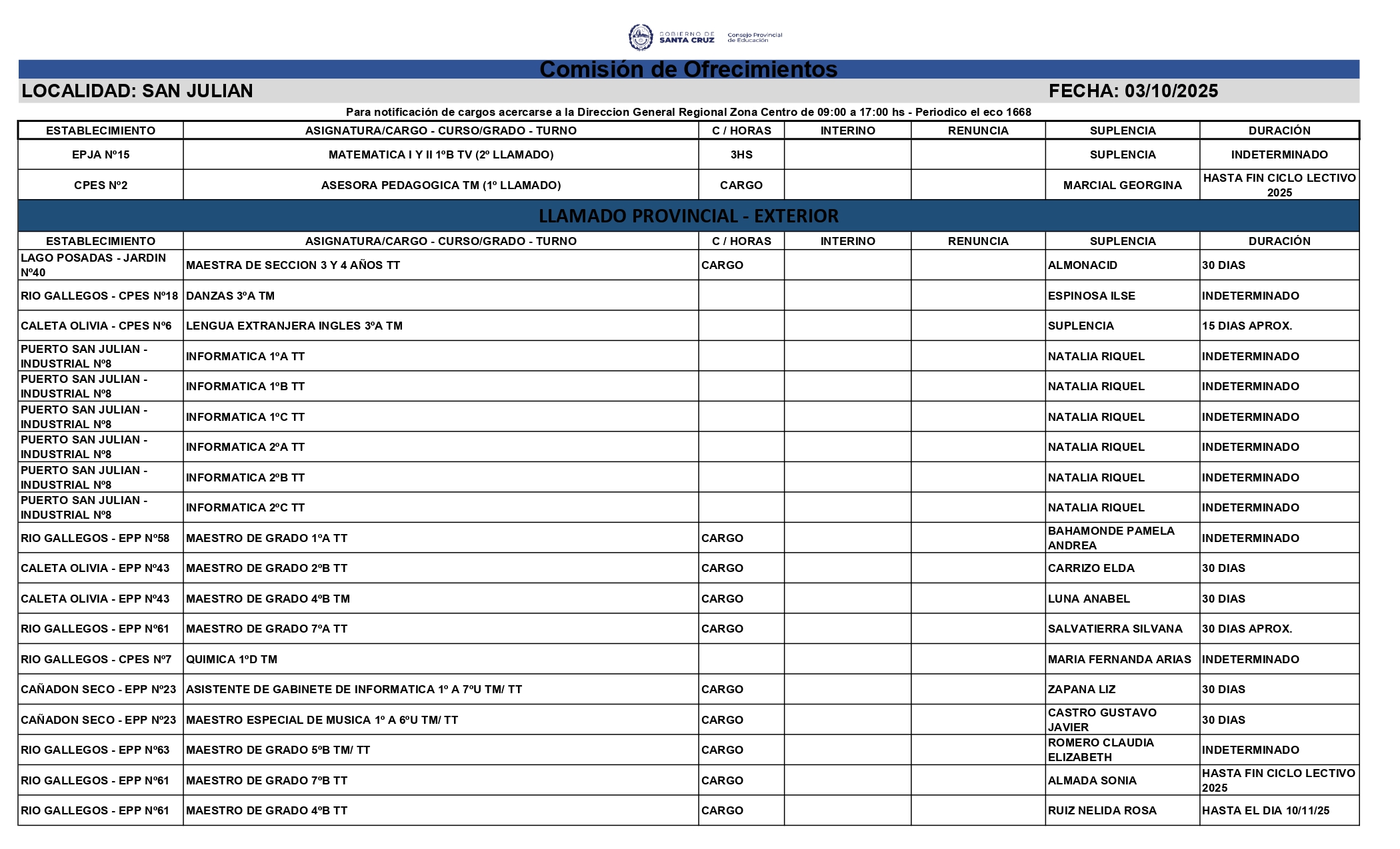 02/10/2025 | El Consejo Provincial de Educación, a través de las Comisiones de Ofrecimientos, informa que se encuentran disponibles los listados para acceder a los cargos y horas cátedra en establecimientos de diferentes localidades. Los mismos se realizarán de manera presencial.