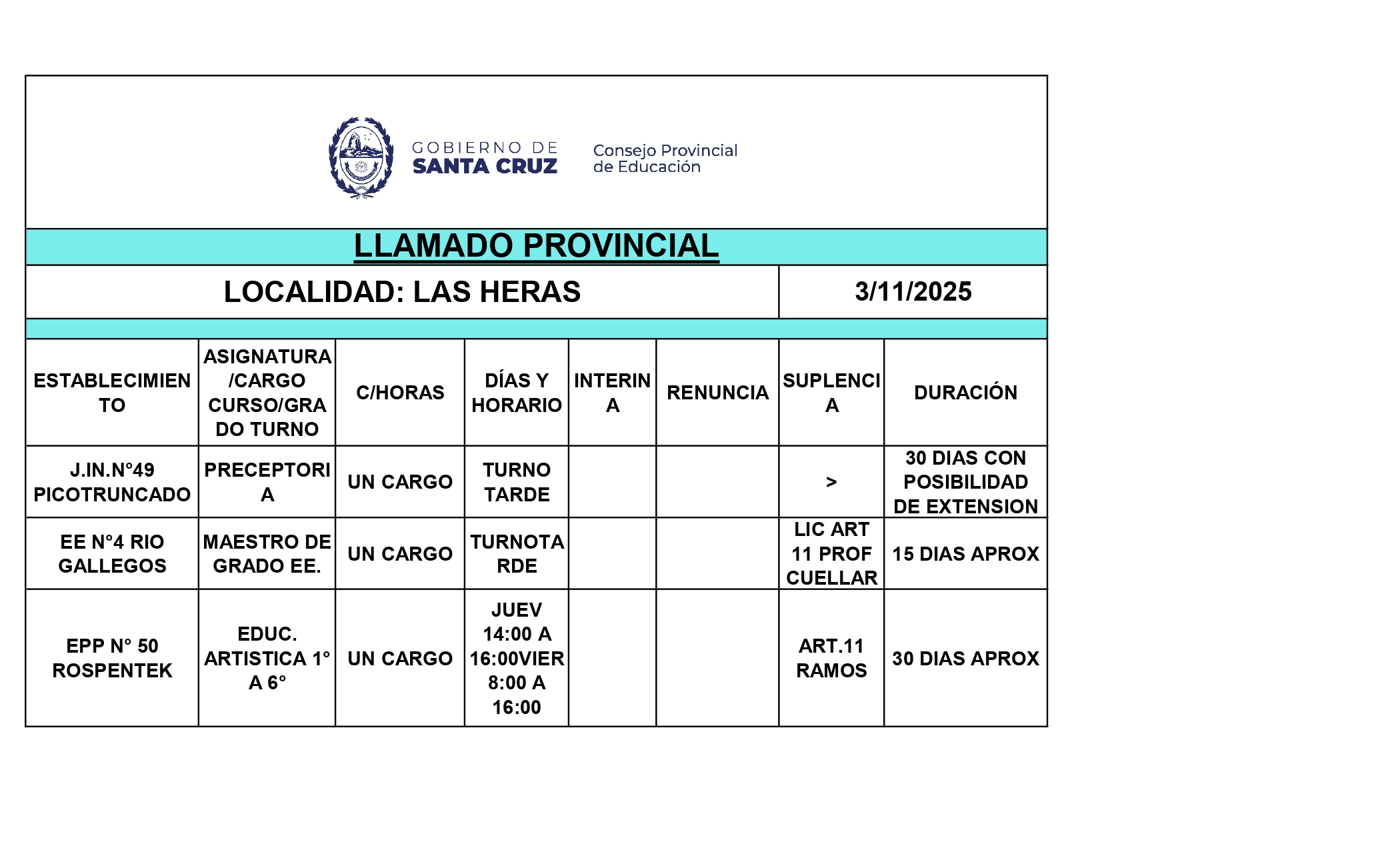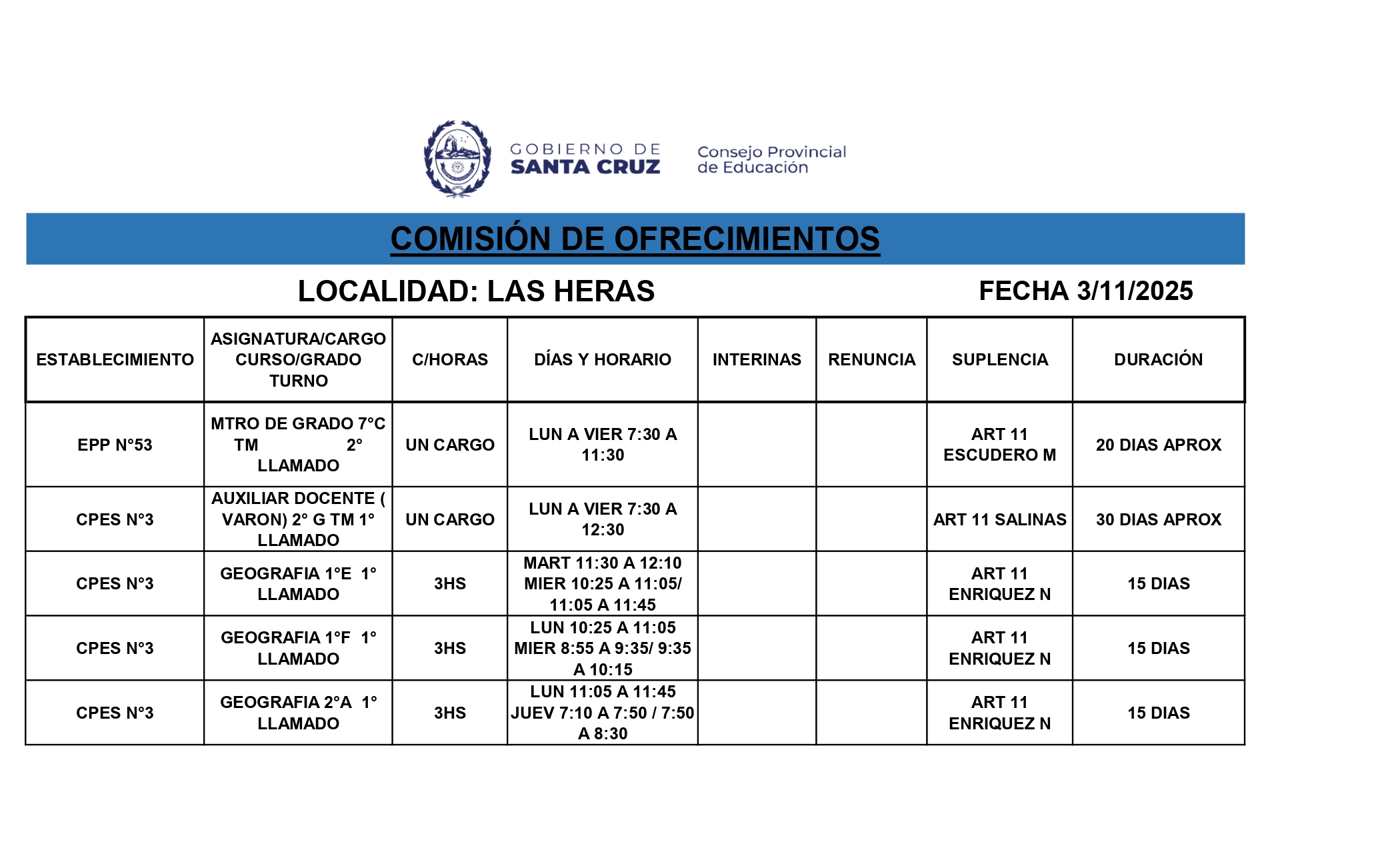 03/11/2025 | El Consejo Provincial de Educación, a través de las Comisiones de Ofrecimientos, informa que se encuentran disponibles los listados para acceder a los cargos y horas cátedra en establecimientos de diferentes localidades. Los mismos se realizarán de manera presencial.