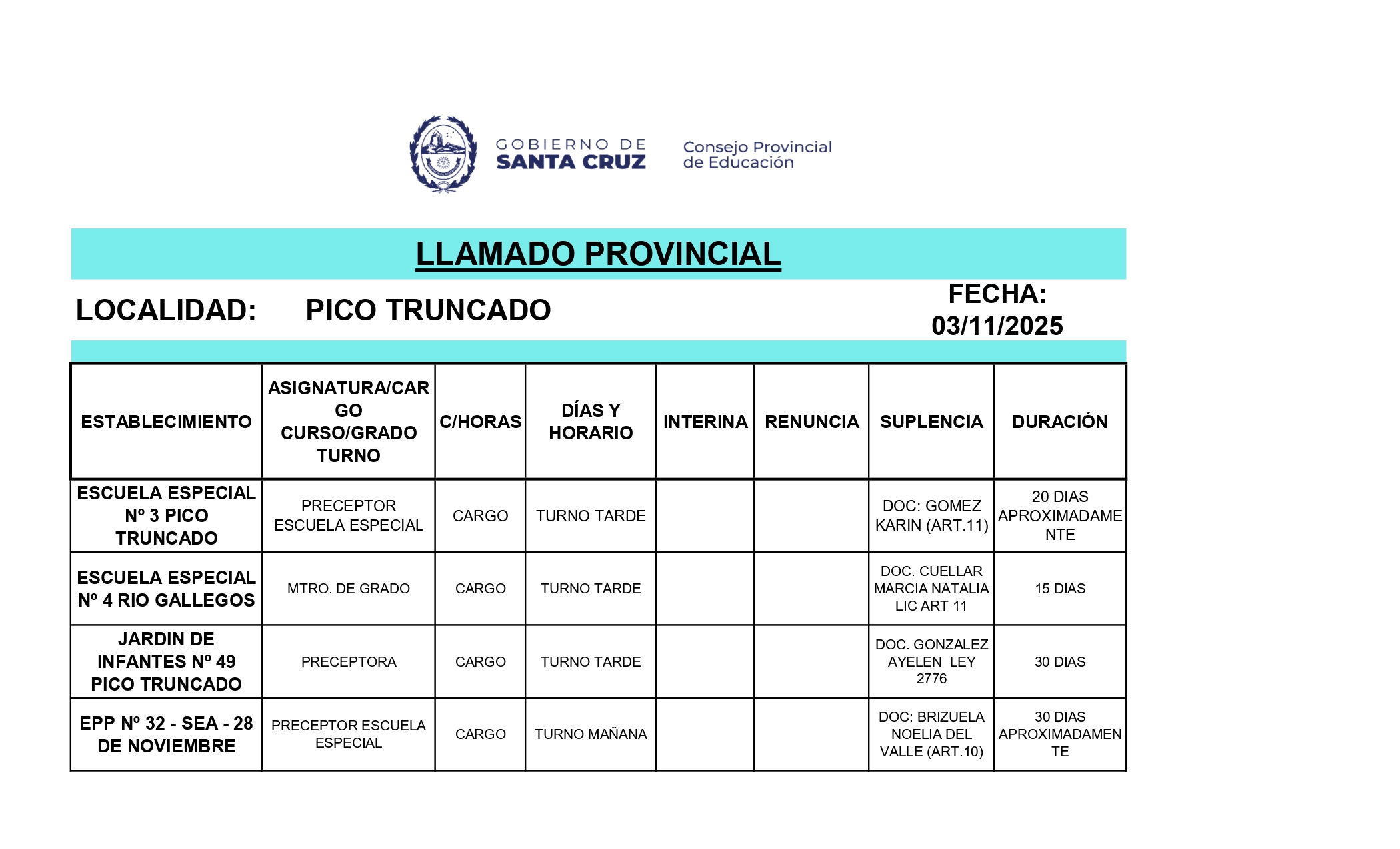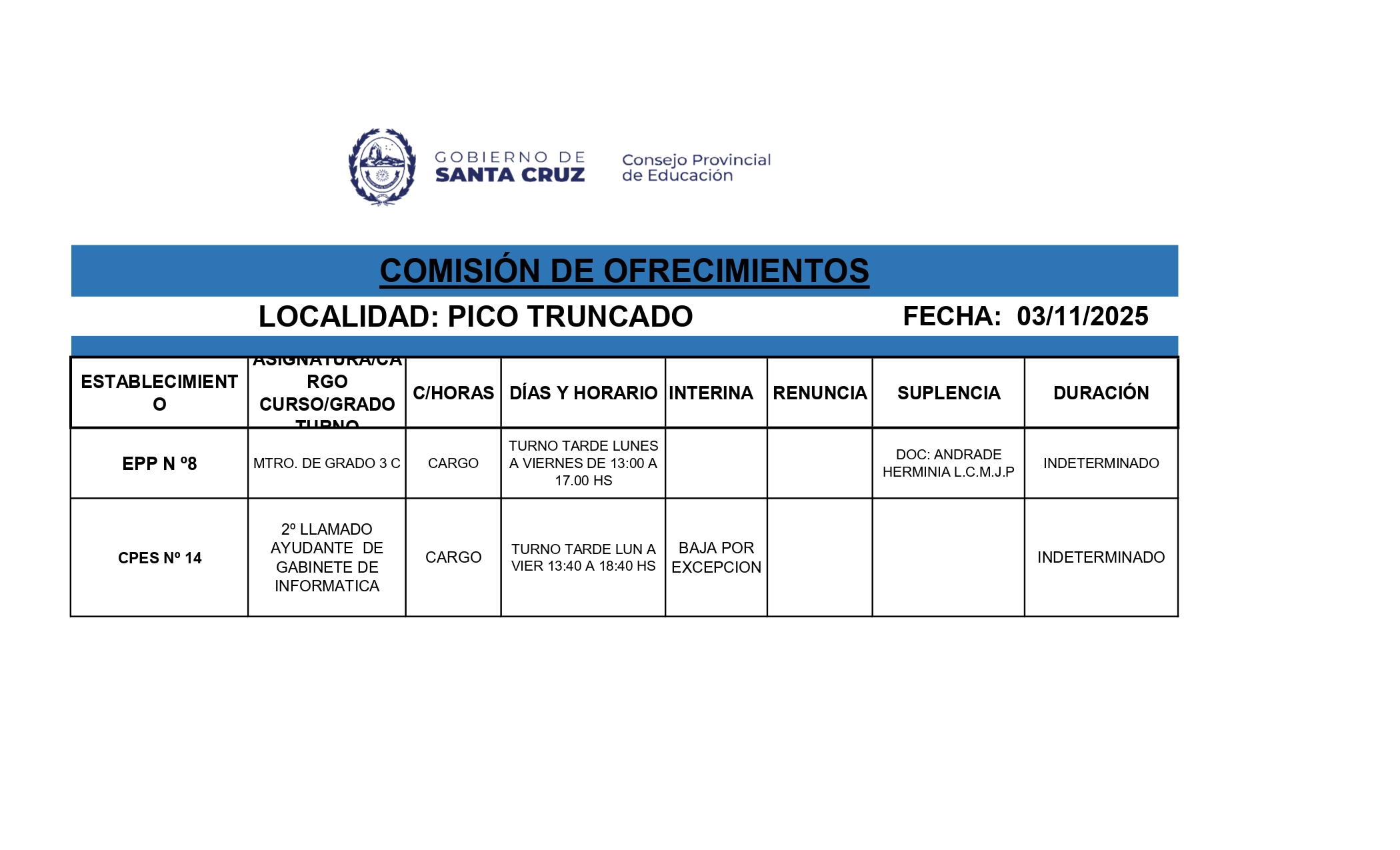 03/11/2025 | El Consejo Provincial de Educación, a través de las Comisiones de Ofrecimientos, informa que se encuentran disponibles los listados para acceder a los cargos y horas cátedra en establecimientos de diferentes localidades. Los mismos se realizarán de manera presencial.