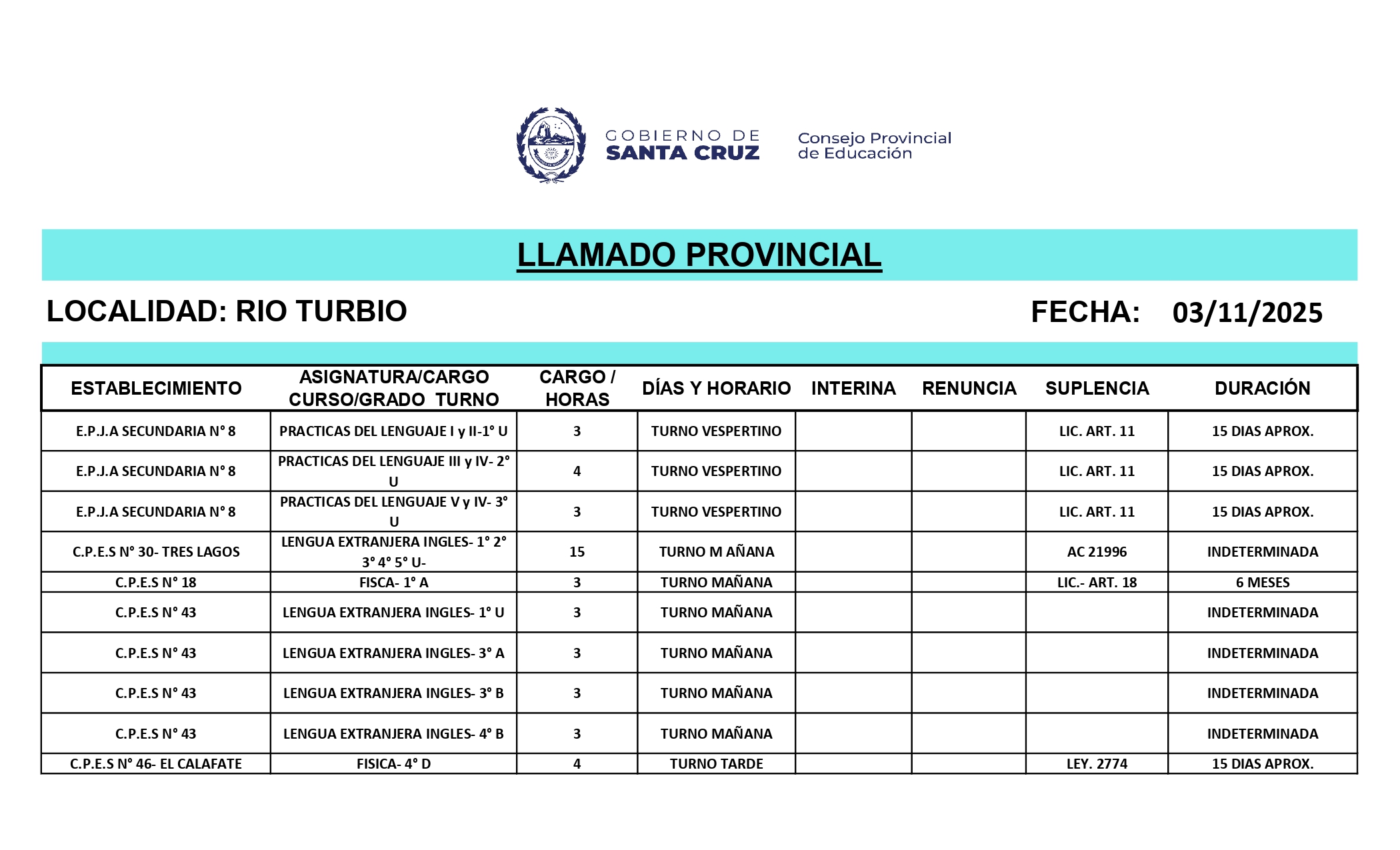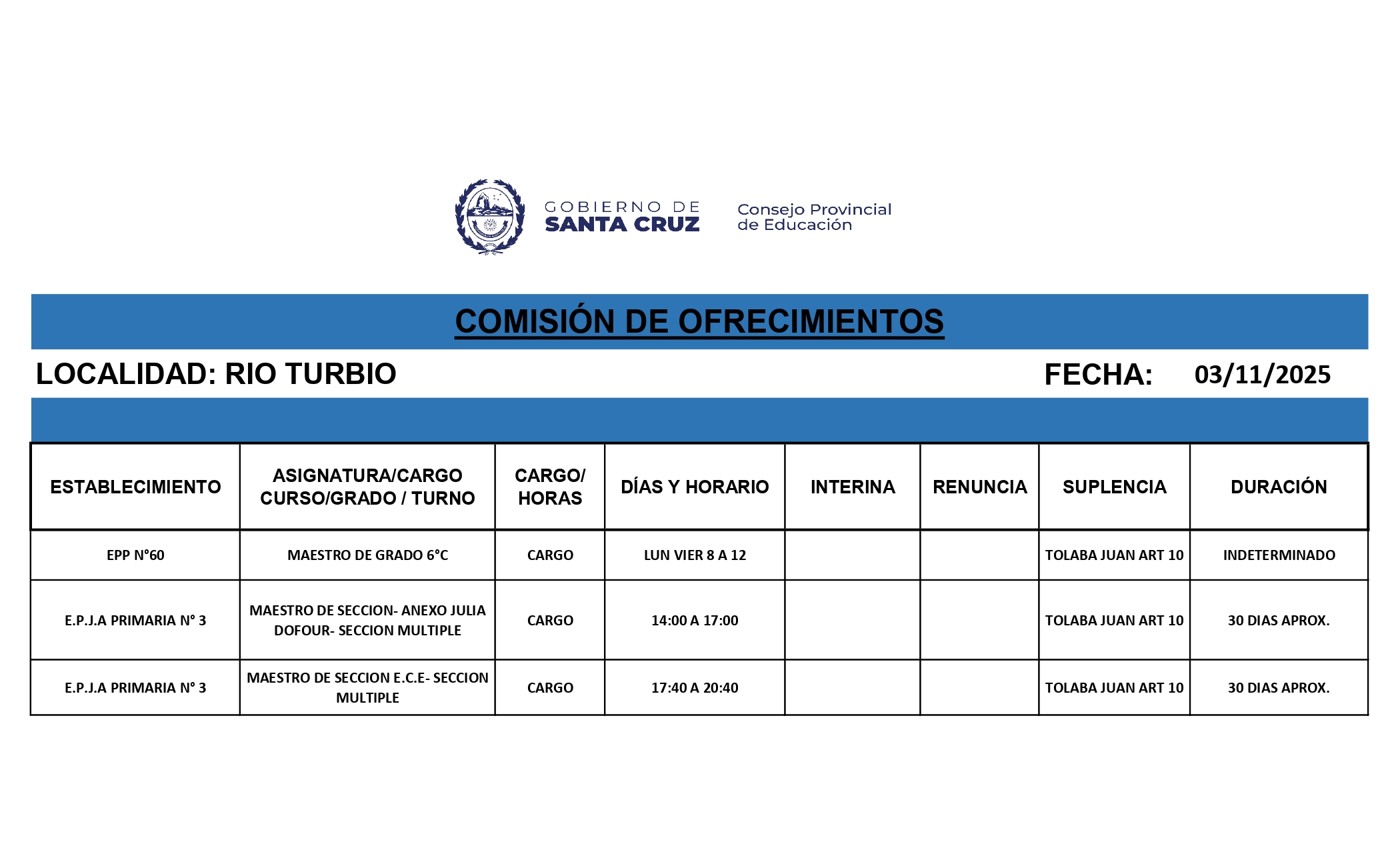 03/11/2025 | El Consejo Provincial de Educación, a través de las Comisiones de Ofrecimientos, informa que se encuentran disponibles los listados para acceder a los cargos y horas cátedra en establecimientos de diferentes localidades. Los mismos se realizarán de manera presencial.