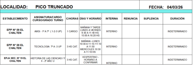 04/03/2026 | El Consejo Provincial de Educación, a través de las Comisiones de Ofrecimientos, informa que se encuentran disponibles los listados para acceder a los cargos y horas cátedra en establecimientos de diferentes localidades. Los mismos se realizarán de manera presencial.