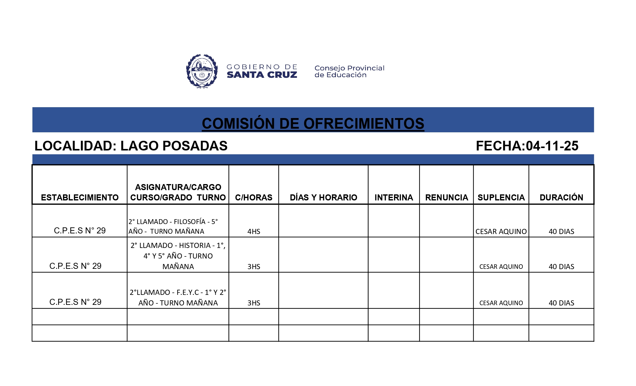04/11/2025 | El Consejo Provincial de Educación, a través de las Comisiones de Ofrecimientos, informa que se encuentran disponibles los listados para acceder a los cargos y horas cátedra en establecimientos de diferentes localidades. Los mismos se realizarán de manera presencial.