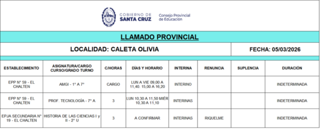 05/03/2026 | El Consejo Provincial de Educación, a través de las Comisiones de Ofrecimientos, informa que se encuentran disponibles los listados para acceder a los cargos y horas cátedra en establecimientos de diferentes localidades. Los mismos se realizarán de manera presencial.