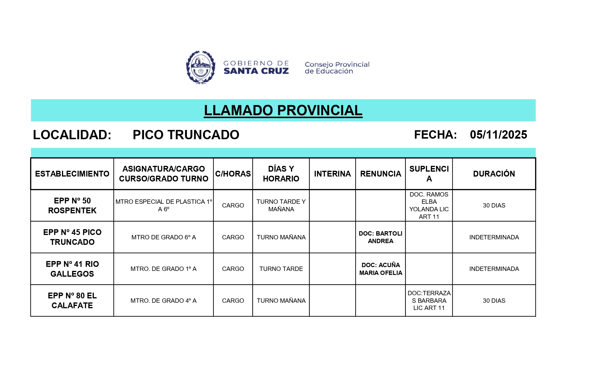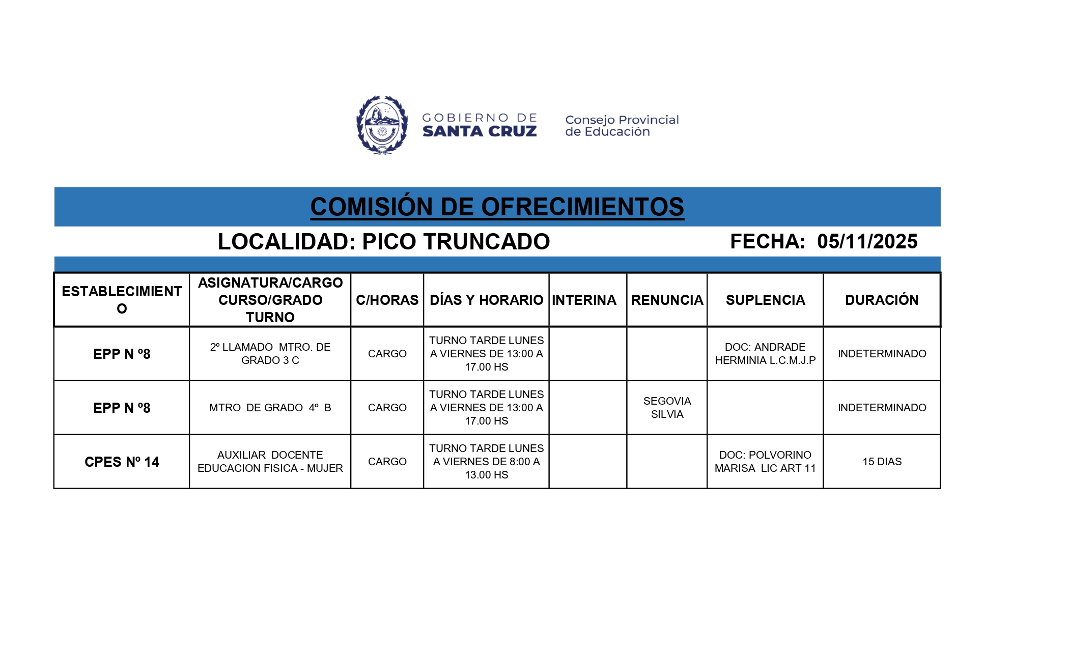 05/11/2025 | El Consejo Provincial de Educación, a través de las Comisiones de Ofrecimientos, informa que se encuentran disponibles los listados para acceder a los cargos y horas cátedra en establecimientos de diferentes localidades. Los mismos se realizarán de manera presencial.
