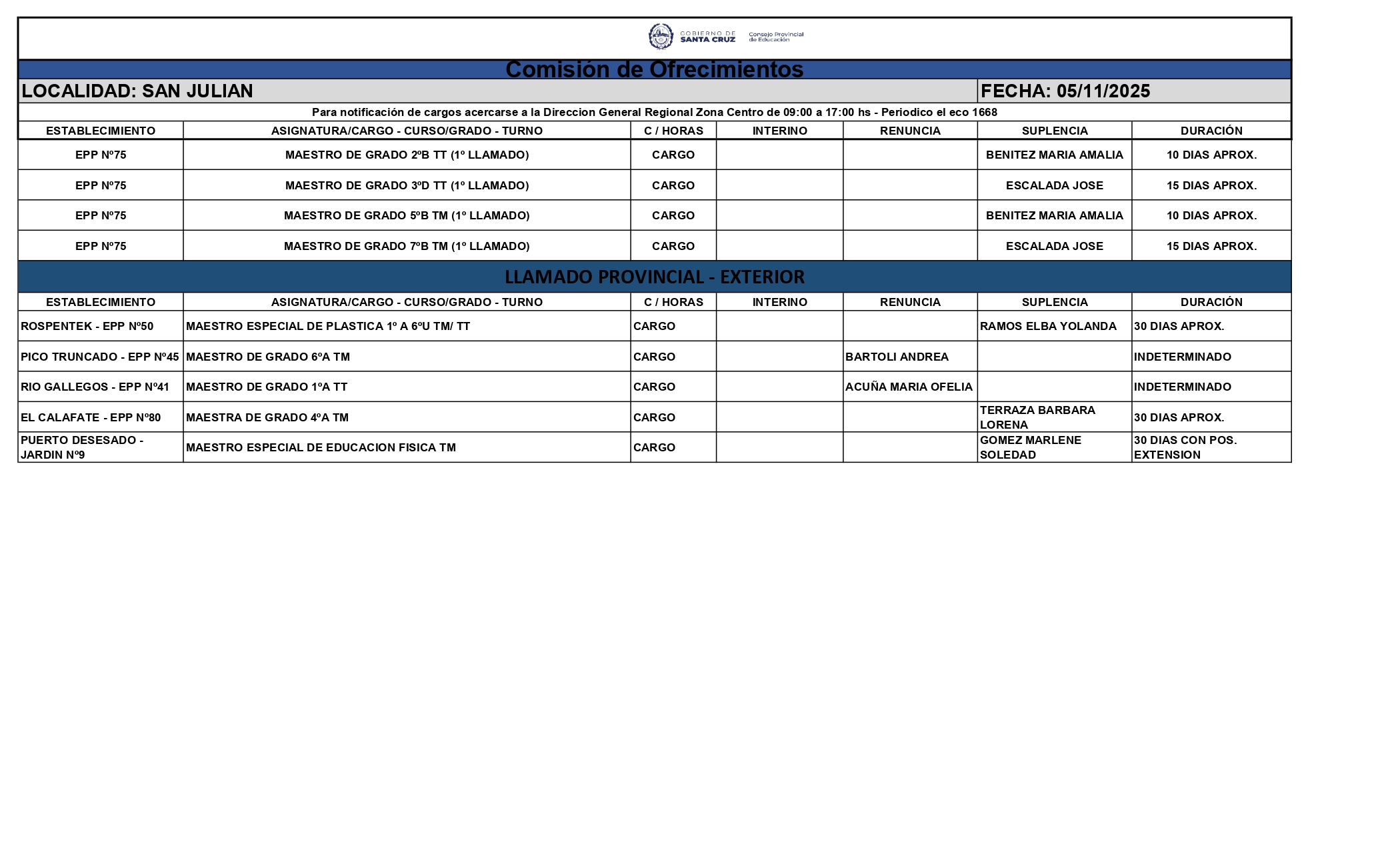 05/11/2025 | El Consejo Provincial de Educación, a través de las Comisiones de Ofrecimientos, informa que se encuentran disponibles los listados para acceder a los cargos y horas cátedra en establecimientos de diferentes localidades. Los mismos se realizarán de manera presencial.