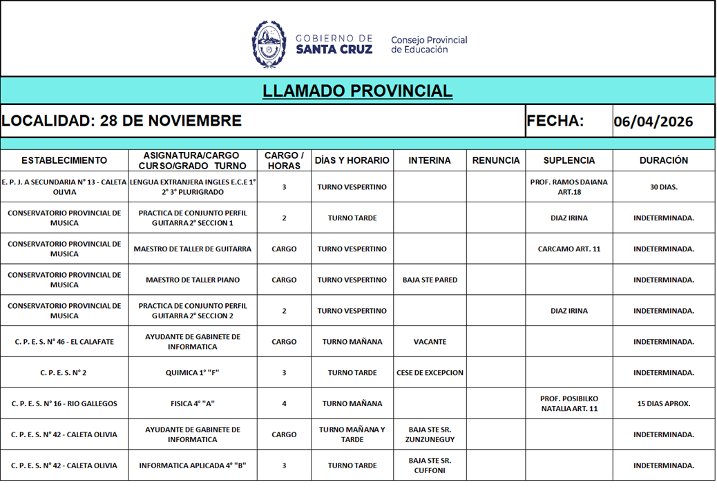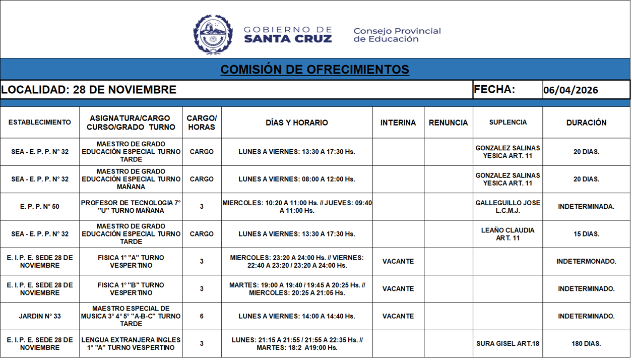 06/04/2026 | El Consejo Provincial de Educación, a través de las Comisiones de Ofrecimientos, informa que se encuentran disponibles los listados para acceder a los cargos y horas cátedra en establecimientos de diferentes localidades. Los mismos se realizarán de manera presencial.