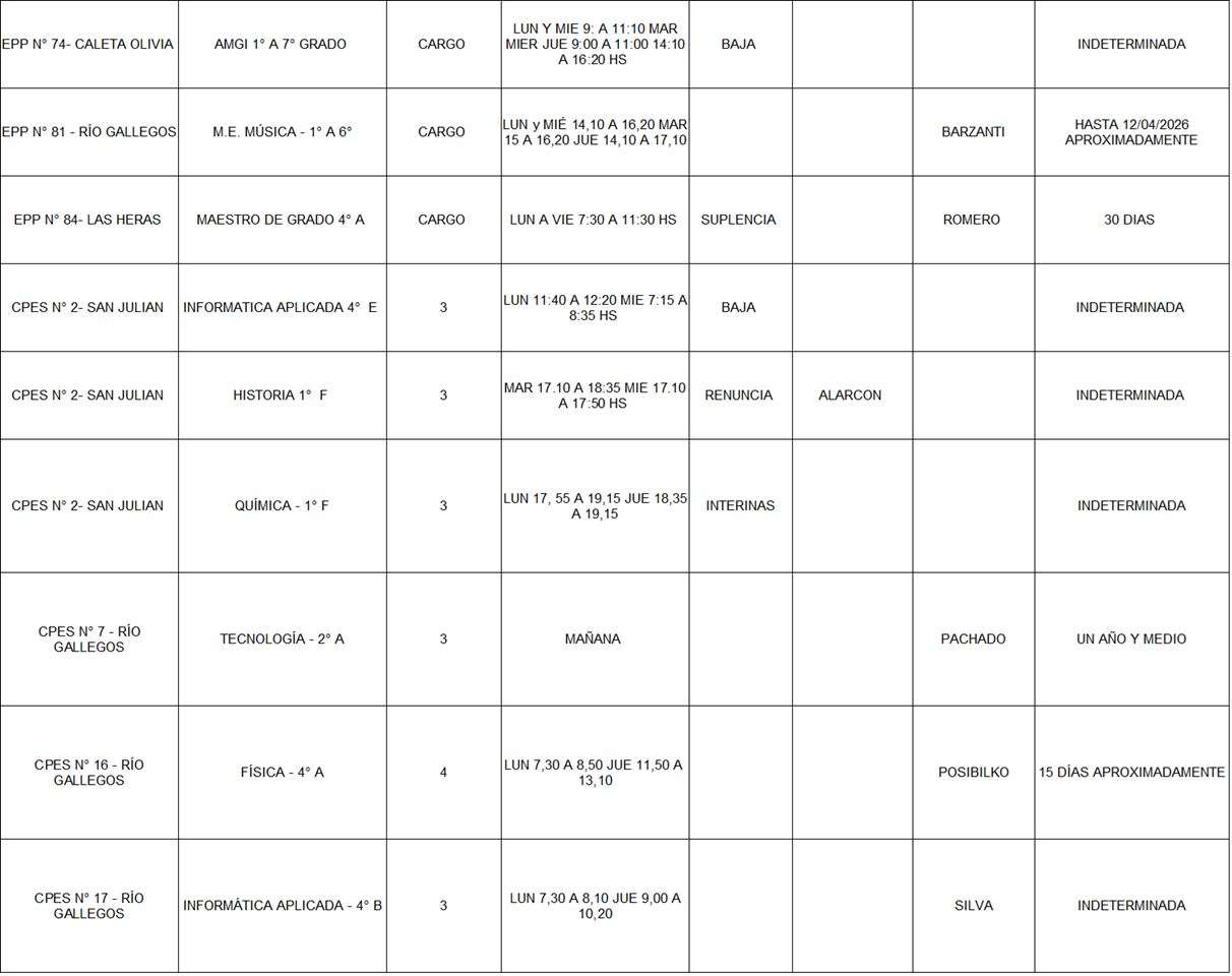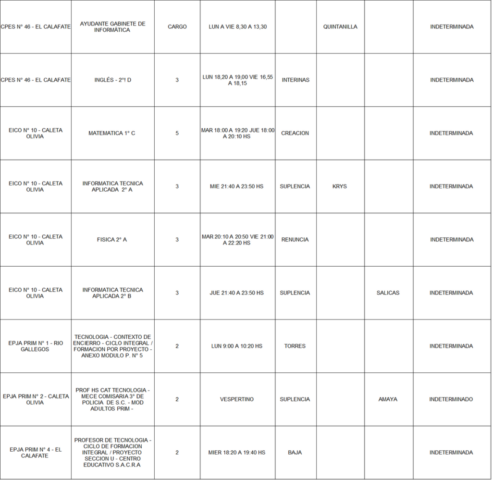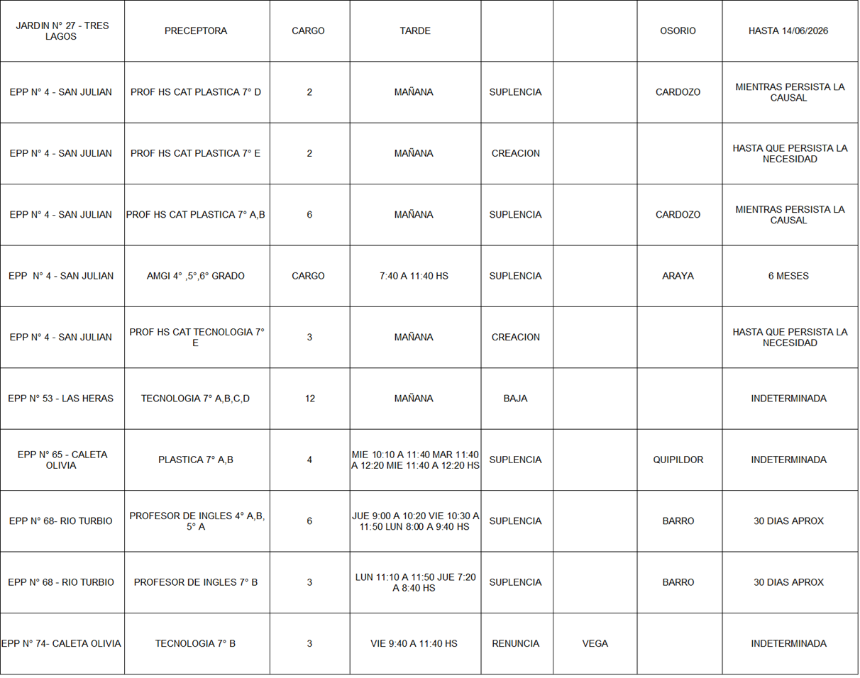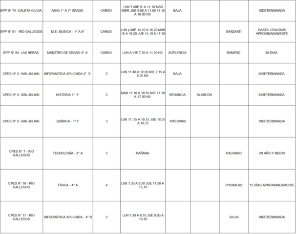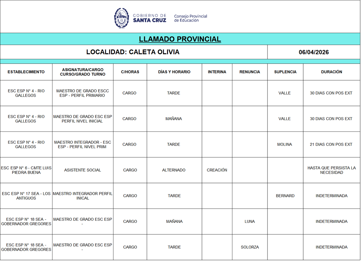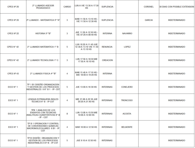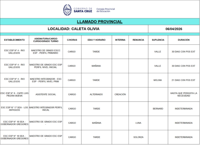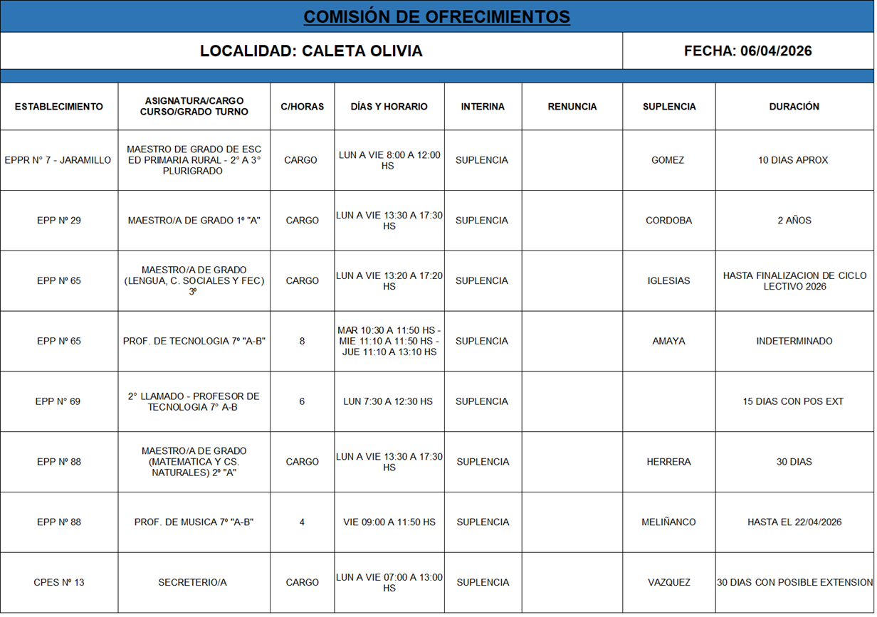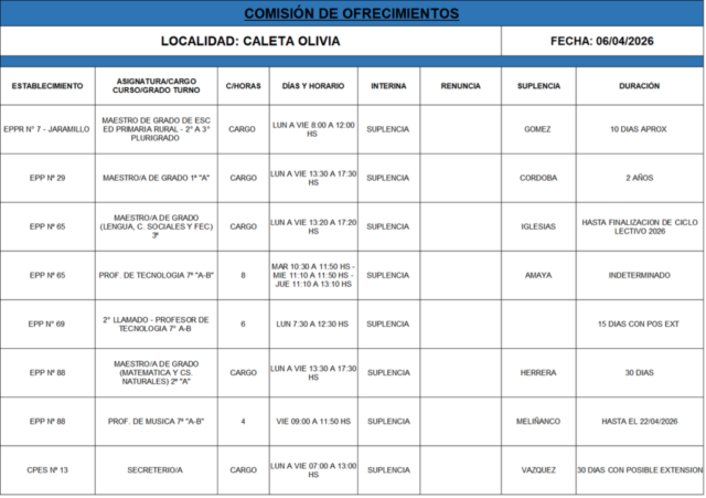 06/04/2026 | El Consejo Provincial de Educación, a través de las Comisiones de Ofrecimientos, informa que se encuentran disponibles los listados para acceder a los cargos y horas cátedra en establecimientos de diferentes localidades. Los mismos se realizarán de manera presencial.