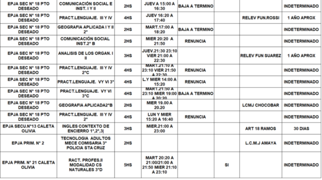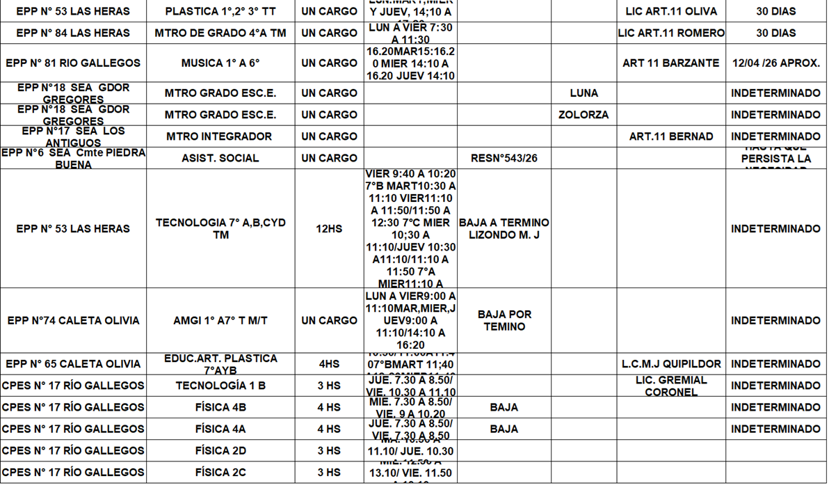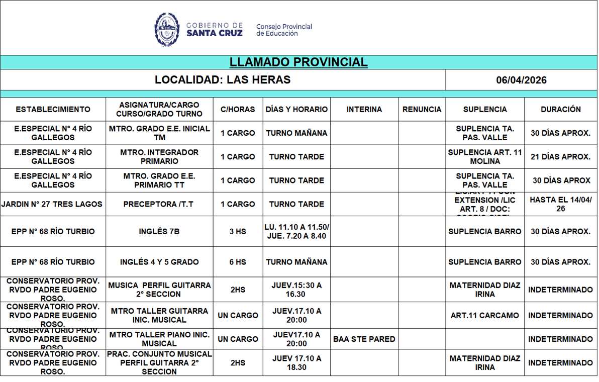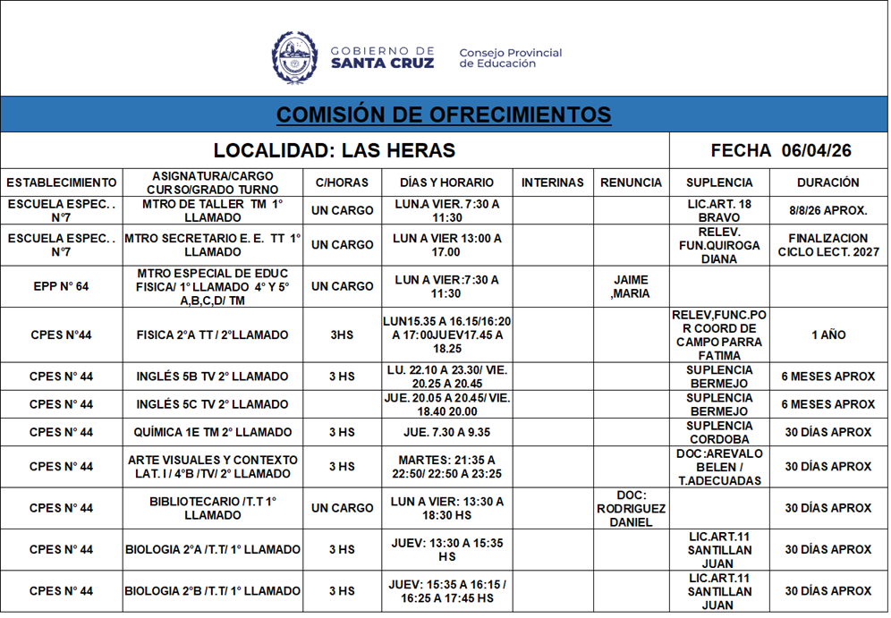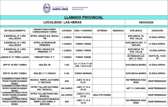 06/04/2026 | El Consejo Provincial de Educación, a través de las Comisiones de Ofrecimientos, informa que se encuentran disponibles los listados para acceder a los cargos y horas cátedra en establecimientos de diferentes localidades. Los mismos se realizarán de manera presencial.