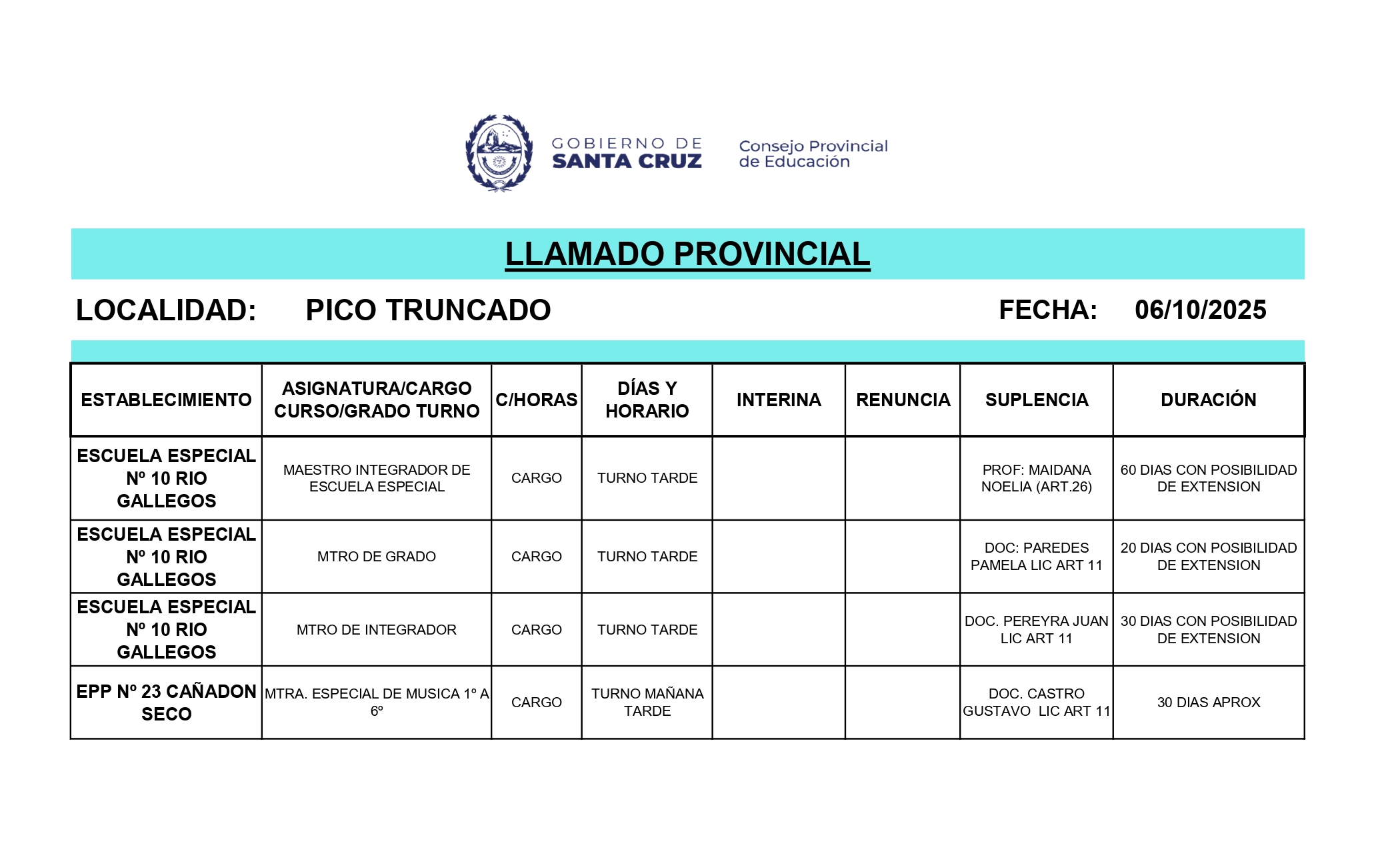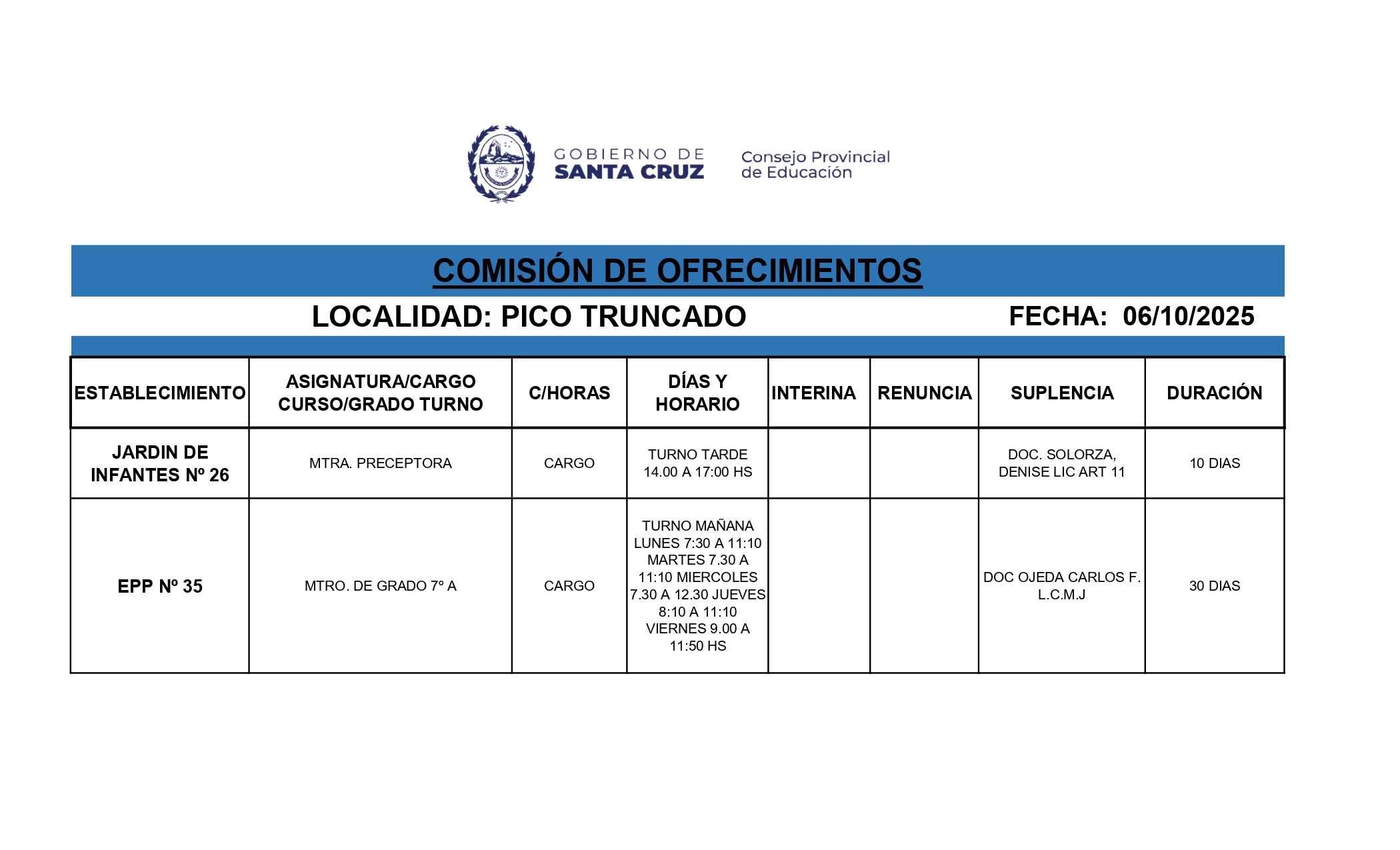 03/10/2025 | El Consejo Provincial de Educación, a través de las Comisiones de Ofrecimientos, informa que se encuentran disponibles los listados para acceder a los cargos y horas cátedra en establecimientos de diferentes localidades. Los mismos se realizarán de manera presencial.