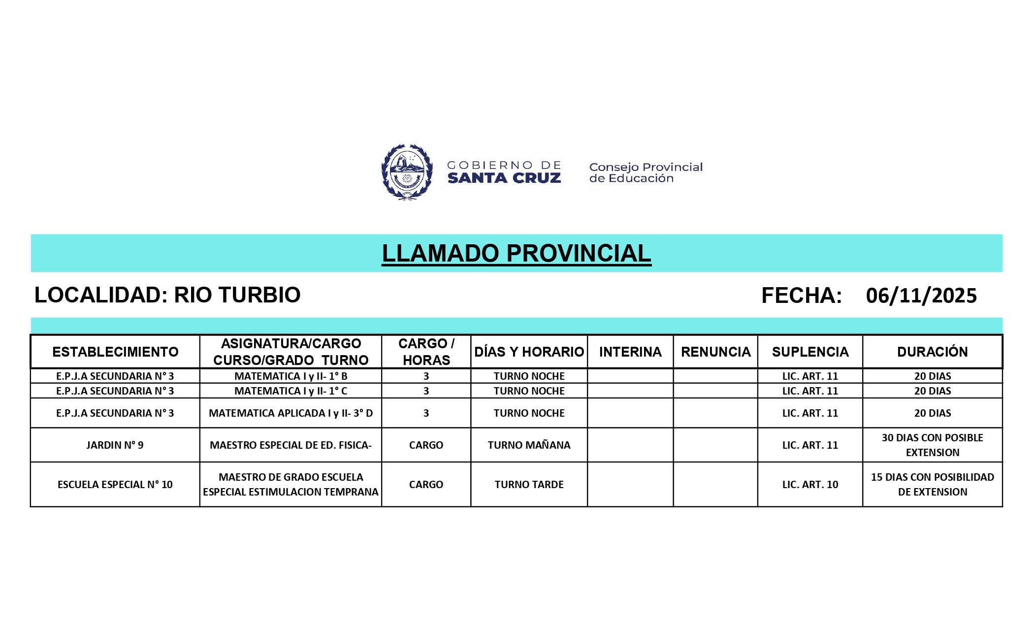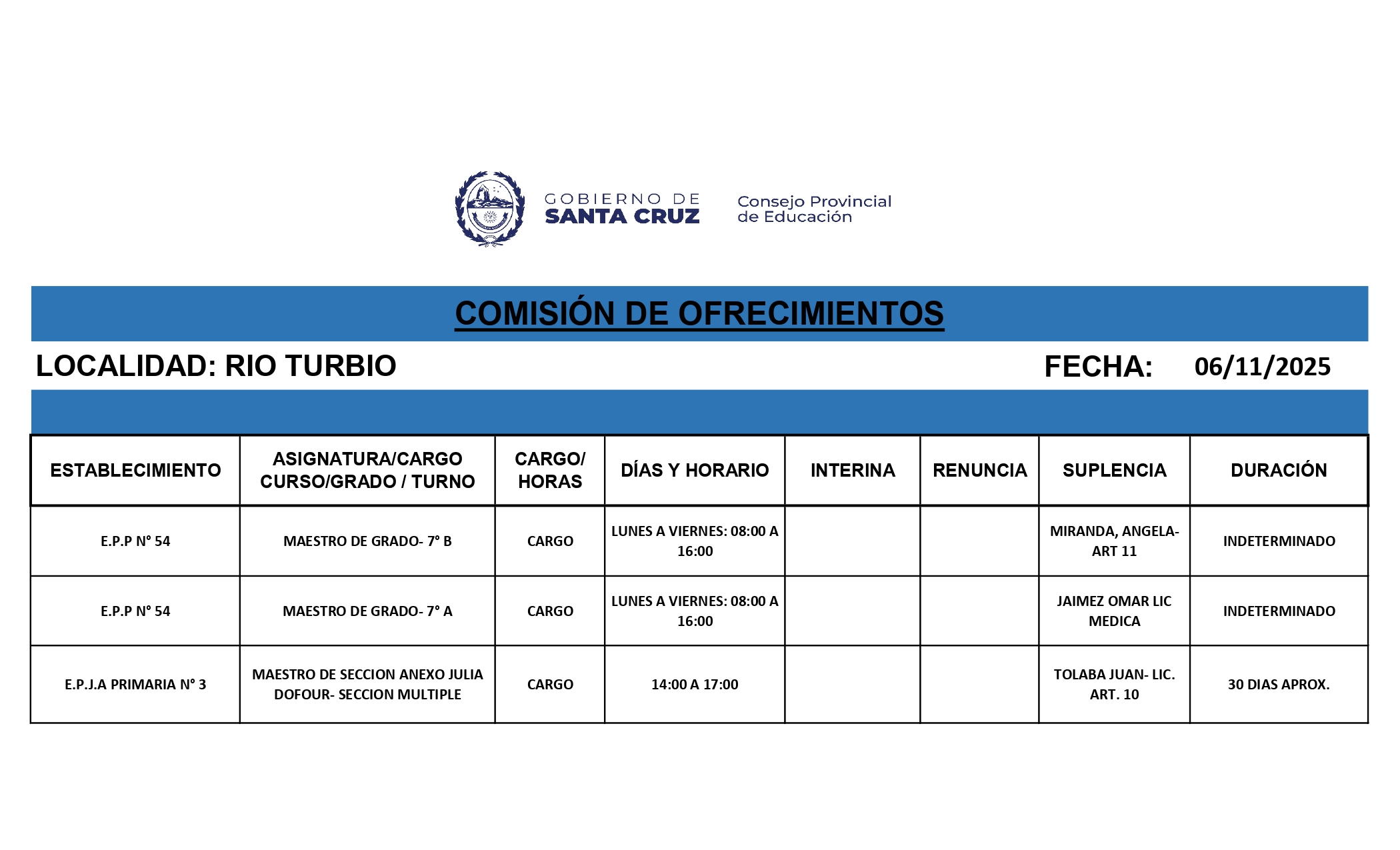 06/11/2025 | El Consejo Provincial de Educación, a través de las Comisiones de Ofrecimientos, informa que se encuentran disponibles los listados para acceder a los cargos y horas cátedra en establecimientos de diferentes localidades. Los mismos se realizarán de manera presencial.