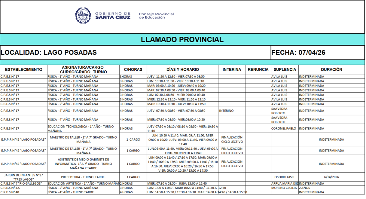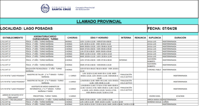 07/04/2026 | El Consejo Provincial de Educación, a través de las Comisiones de Ofrecimientos, informa que se encuentran disponibles los listados para acceder a los cargos y horas cátedra en establecimientos de diferentes localidades. Los mismos se realizarán de manera presencial.