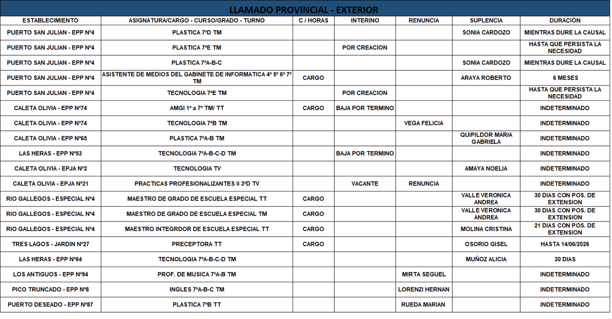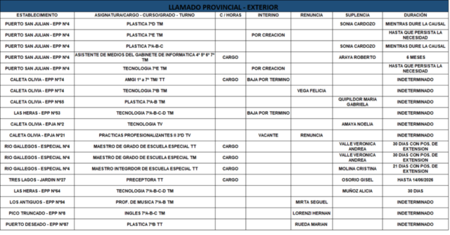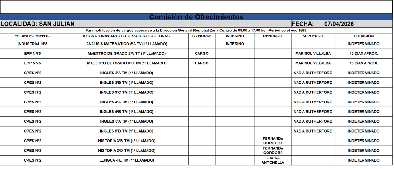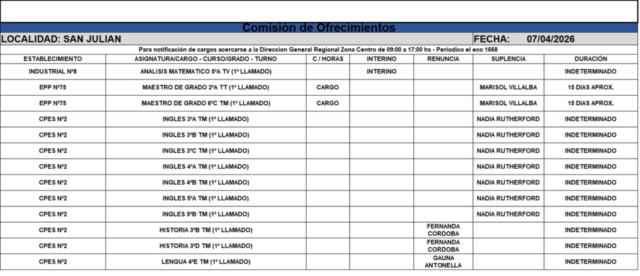 07/04/2026 | El Consejo Provincial de Educación, a través de las Comisiones de Ofrecimientos, informa que se encuentran disponibles los listados para acceder a los cargos y horas cátedra en establecimientos de diferentes localidades. Los mismos se realizarán de manera presencial.