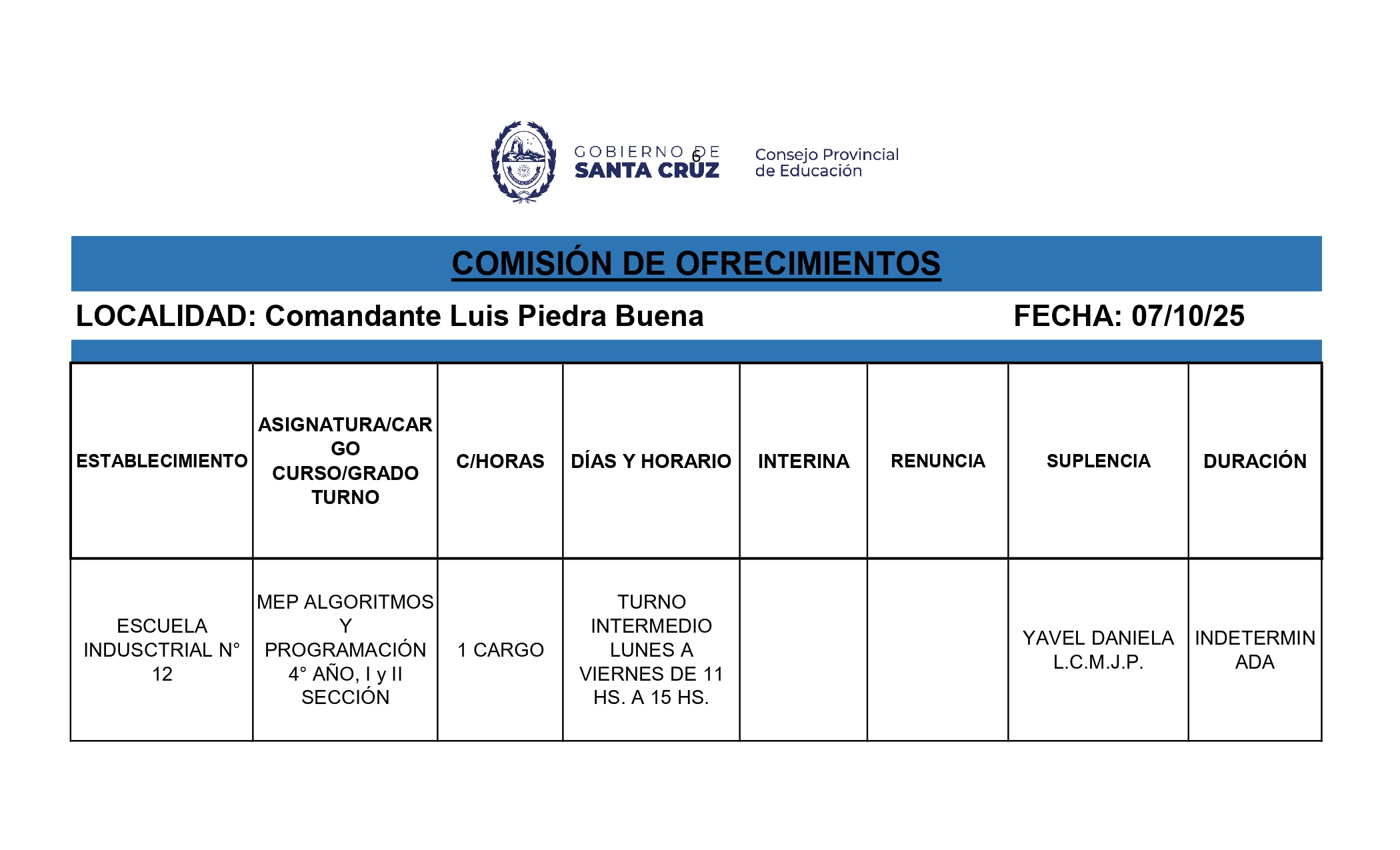 07/10/2025 | El Consejo Provincial de Educación, a través de las Comisiones de Ofrecimientos, informa que se encuentran disponibles los listados para acceder a los cargos y horas cátedra en establecimientos de diferentes localidades. Los mismos se realizarán de manera presencial.