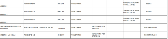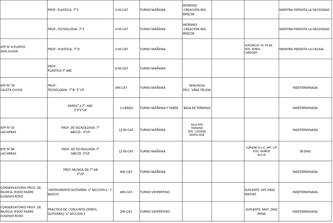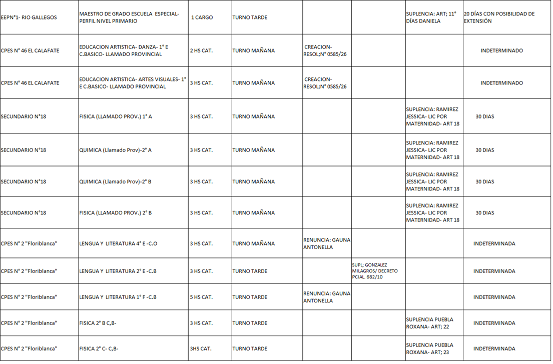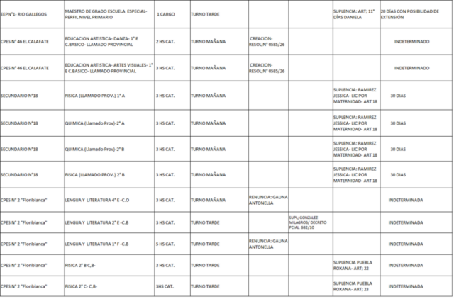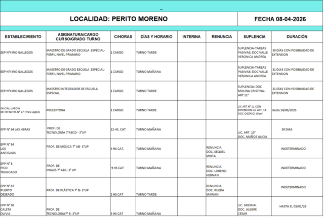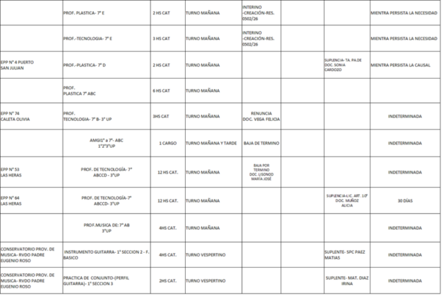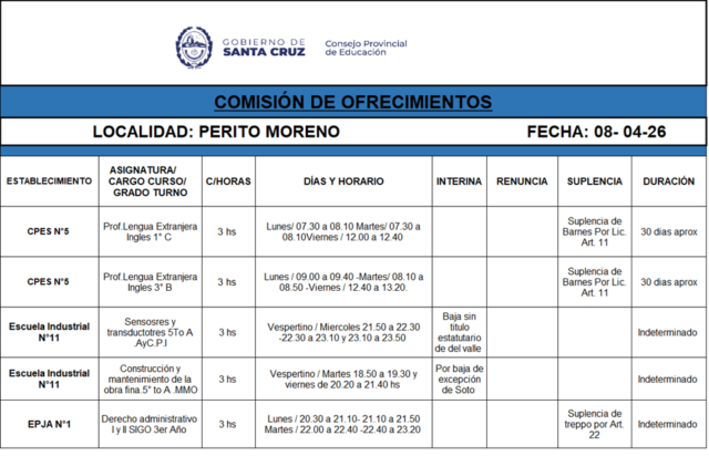 08/04/2026 | El Consejo Provincial de Educación, a través de las Comisiones de Ofrecimientos, informa que se encuentran disponibles los listados para acceder a los cargos y horas cátedra en establecimientos de diferentes localidades. Los mismos se realizarán de manera presencial.