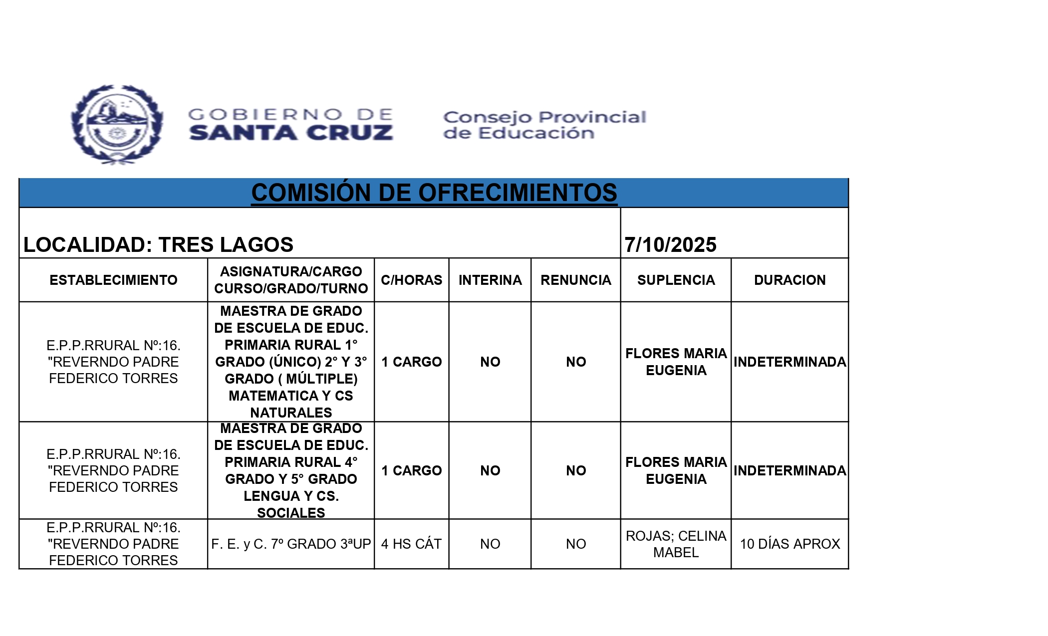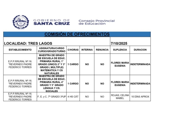 08/10/2025 | El Consejo Provincial de Educación, a través de las Comisiones de Ofrecimientos, informa que se encuentran disponibles los listados para acceder a los cargos y horas cátedra en establecimientos de diferentes localidades. Los mismos se realizarán de manera presencial.