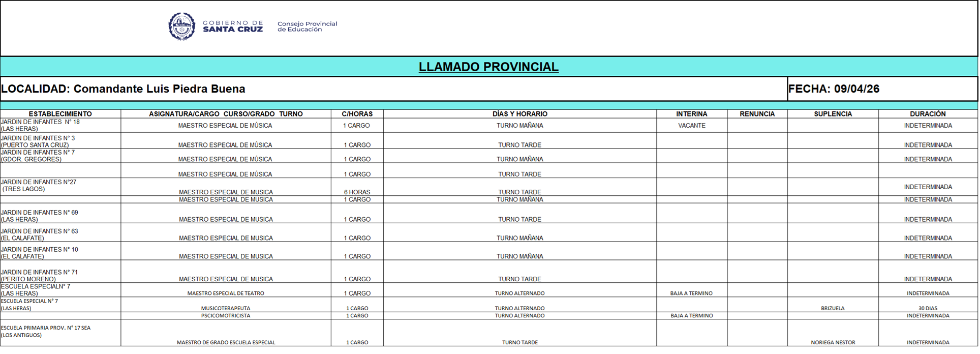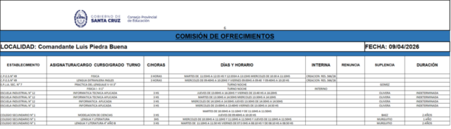 09/04/2026 | El Consejo Provincial de Educación, a través de las Comisiones de Ofrecimientos, informa que se encuentran disponibles los listados para acceder a los cargos y horas cátedra en establecimientos de diferentes localidades. Los mismos se realizarán de manera presencial.