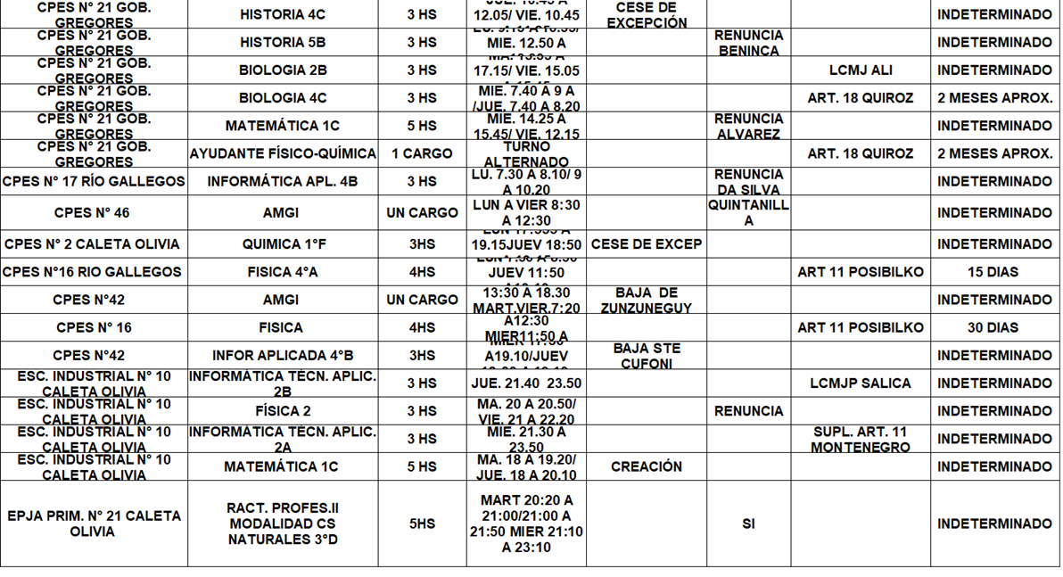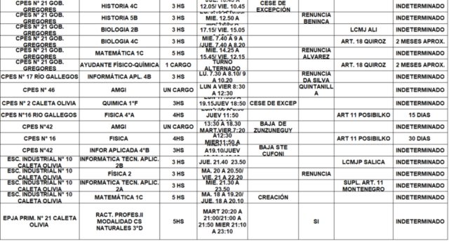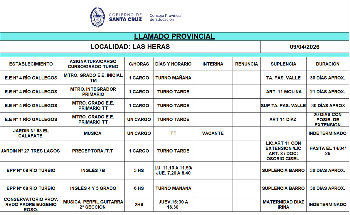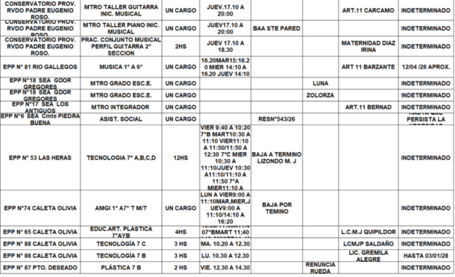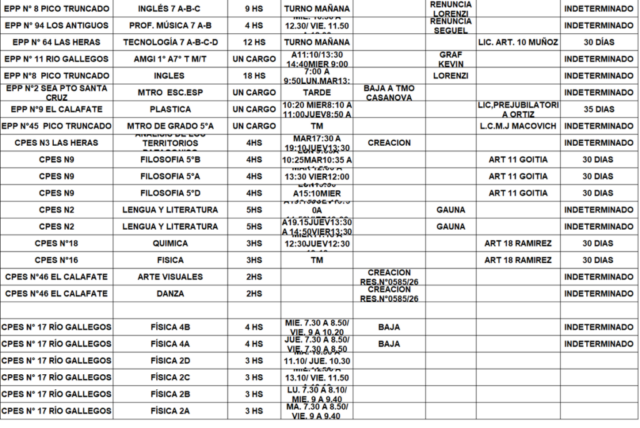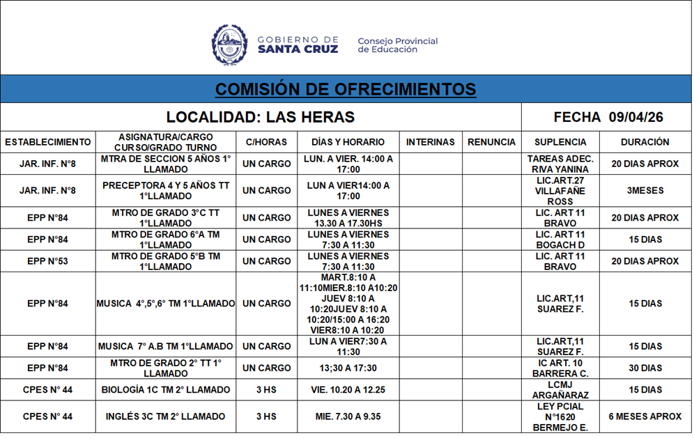 09/04/2026 | El Consejo Provincial de Educación, a través de las Comisiones de Ofrecimientos, informa que se encuentran disponibles los listados para acceder a los cargos y horas cátedra en establecimientos de diferentes localidades. Los mismos se realizarán de manera presencial.