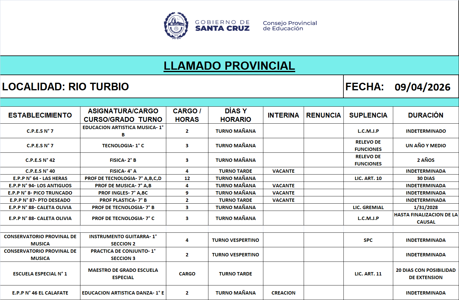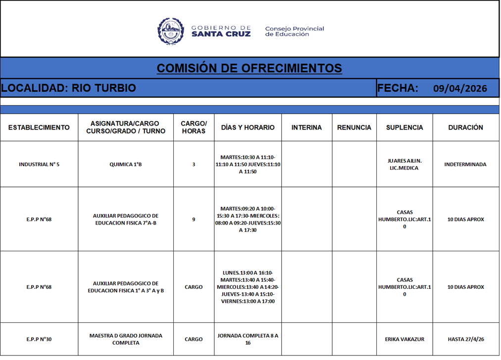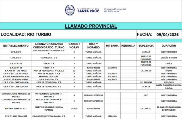 09/04/2026 | El Consejo Provincial de Educación, a través de las Comisiones de Ofrecimientos, informa que se encuentran disponibles los listados para acceder a los cargos y horas cátedra en establecimientos de diferentes localidades. Los mismos se realizarán de manera presencial.
