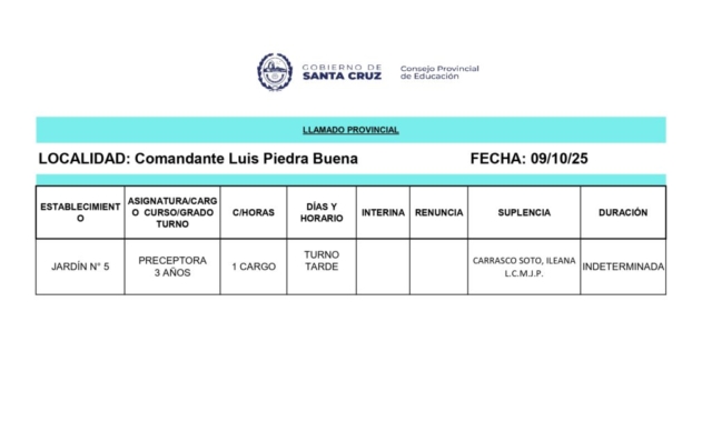 09/10/2025 | El Consejo Provincial de Educación, a través de las Comisiones de Ofrecimientos, informa que se encuentran disponibles los listados para acceder a los cargos y horas cátedra en establecimientos de diferentes localidades. Los mismos se realizarán de manera presencial.