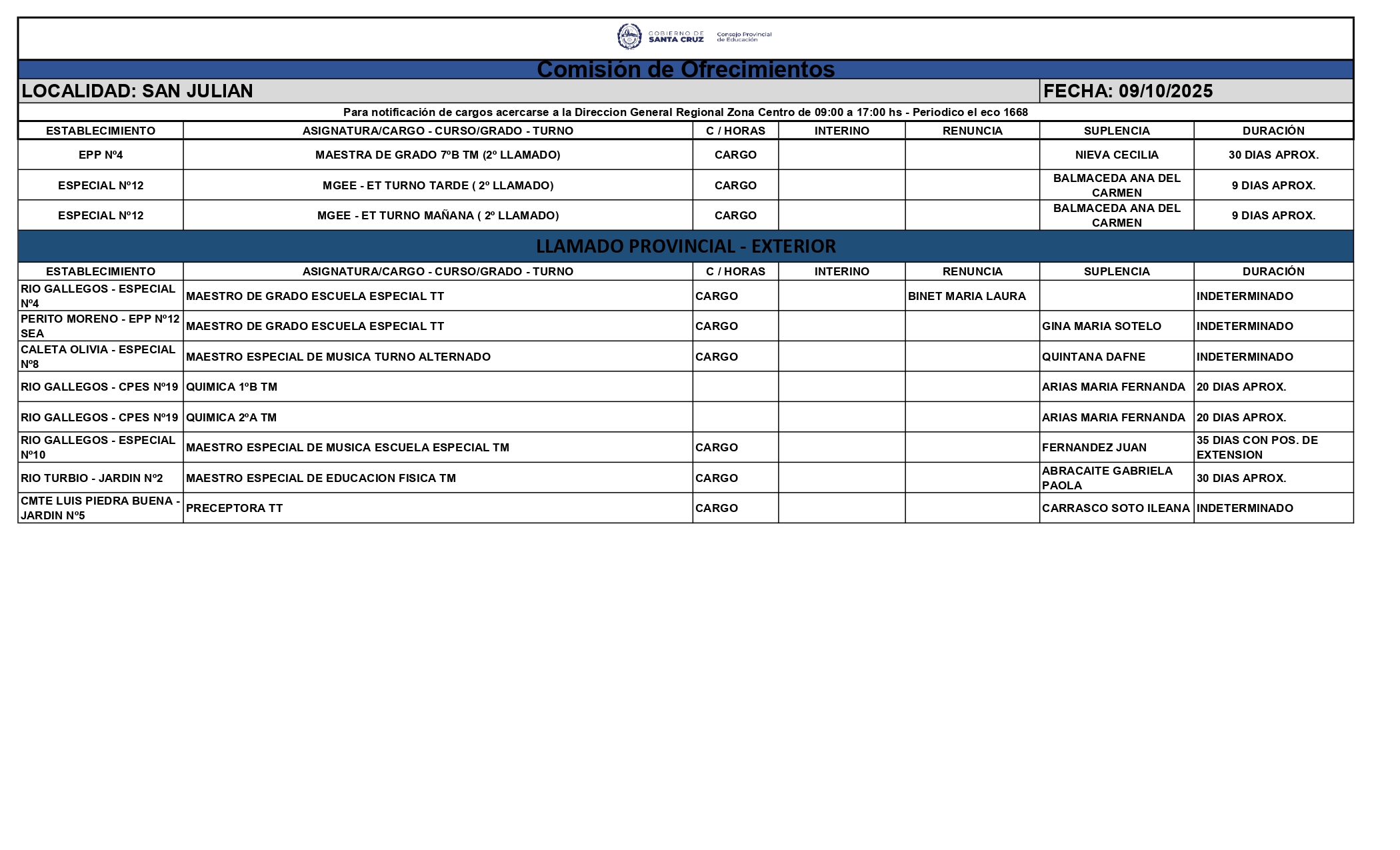 09/10/2025 | El Consejo Provincial de Educación, a través de las Comisiones de Ofrecimientos, informa que se encuentran disponibles los listados para acceder a los cargos y horas cátedra en establecimientos de diferentes localidades. Los mismos se realizarán de manera presencial.