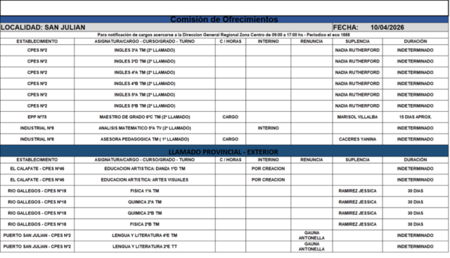 10/04/2026 | El Consejo Provincial de Educación, a través de las Comisiones de Ofrecimientos, informa que se encuentran disponibles los listados para acceder a los cargos y horas cátedra en establecimientos de diferentes localidades. Los mismos se realizarán de manera presencial.