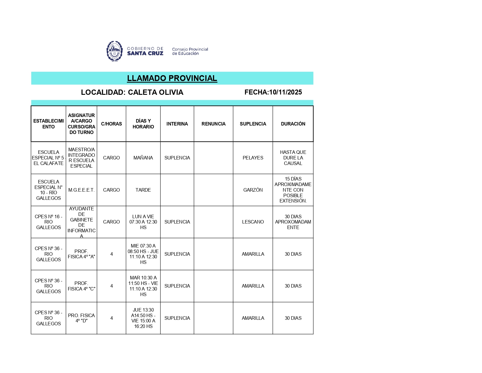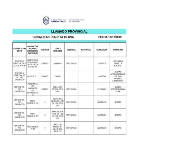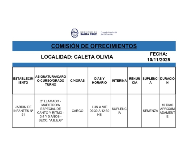 10/11/2025 | El Consejo Provincial de Educación, a través de las Comisiones de Ofrecimientos, informa que se encuentran disponibles los listados para acceder a los cargos y horas cátedra en establecimientos de diferentes localidades. Los mismos se realizarán de manera presencial.