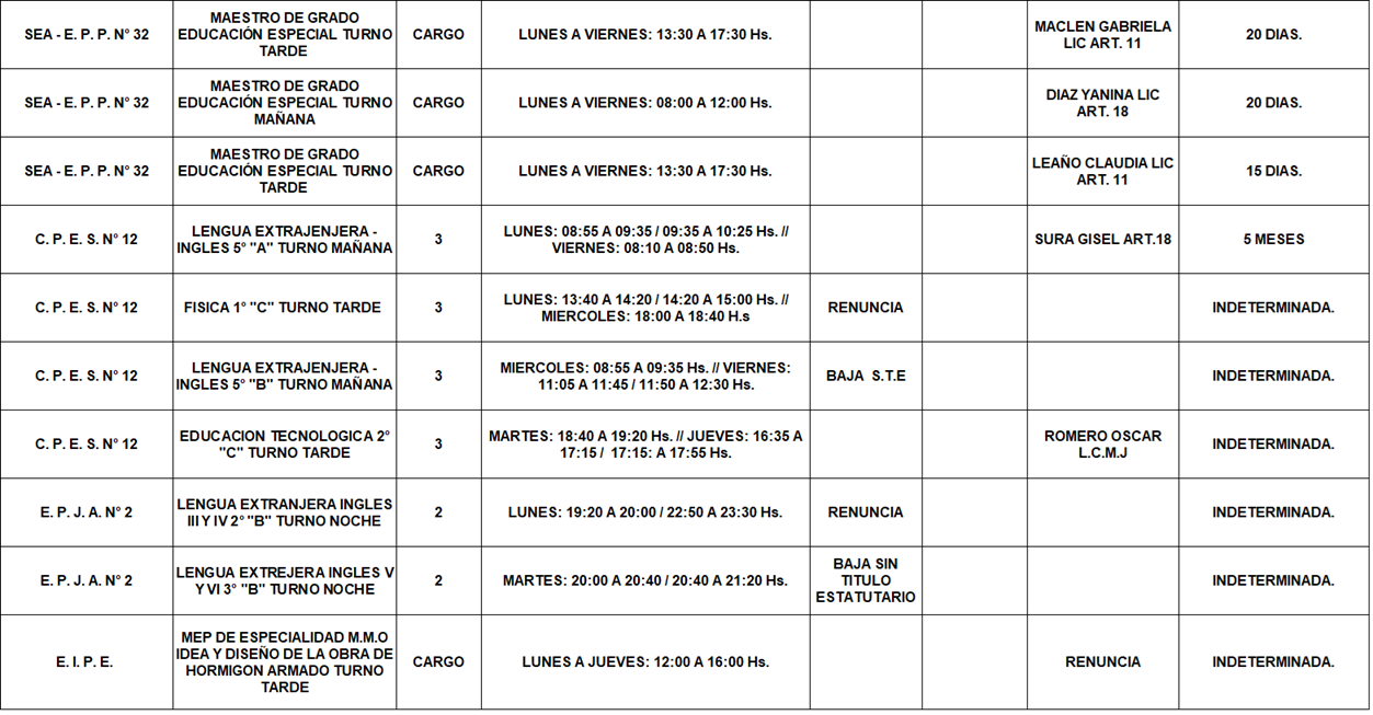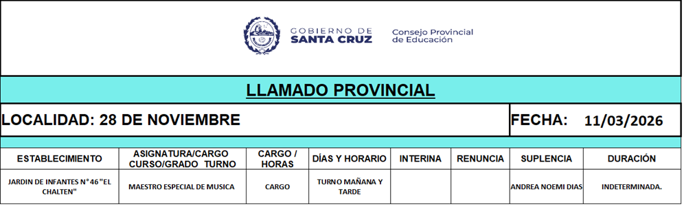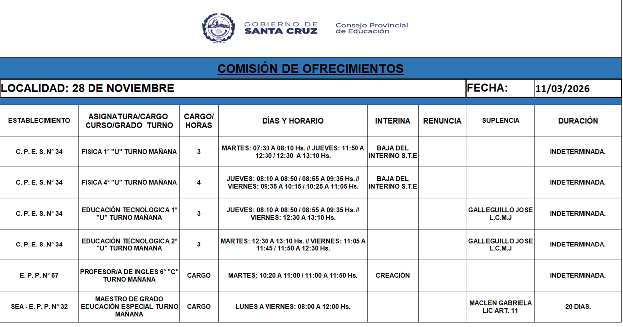 11/03/2026 | El Consejo Provincial de Educación, a través de las Comisiones de Ofrecimientos, informa que se encuentran disponibles los listados para acceder a los cargos y horas cátedra en establecimientos de diferentes localidades. Los mismos se realizarán de manera presencial.