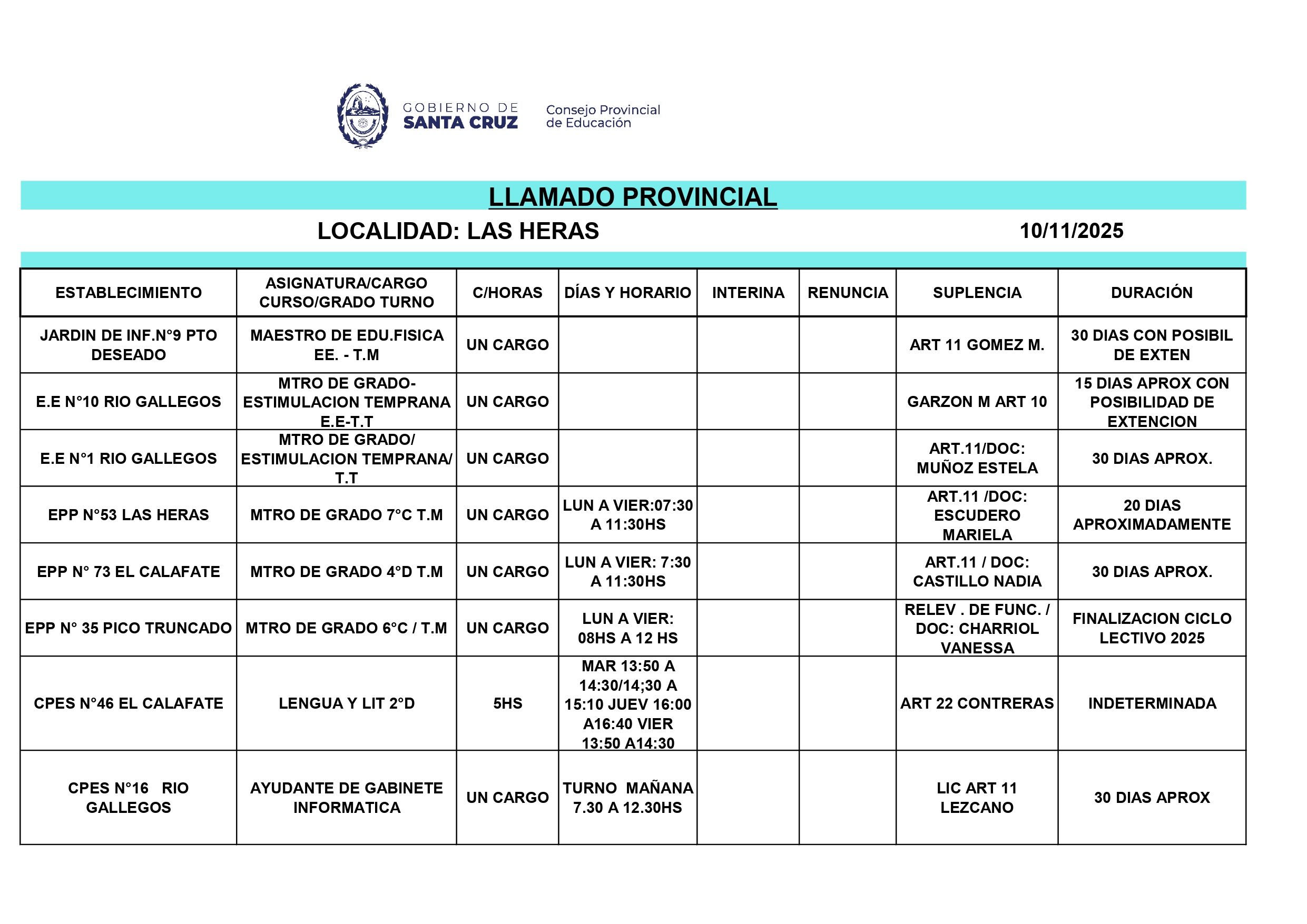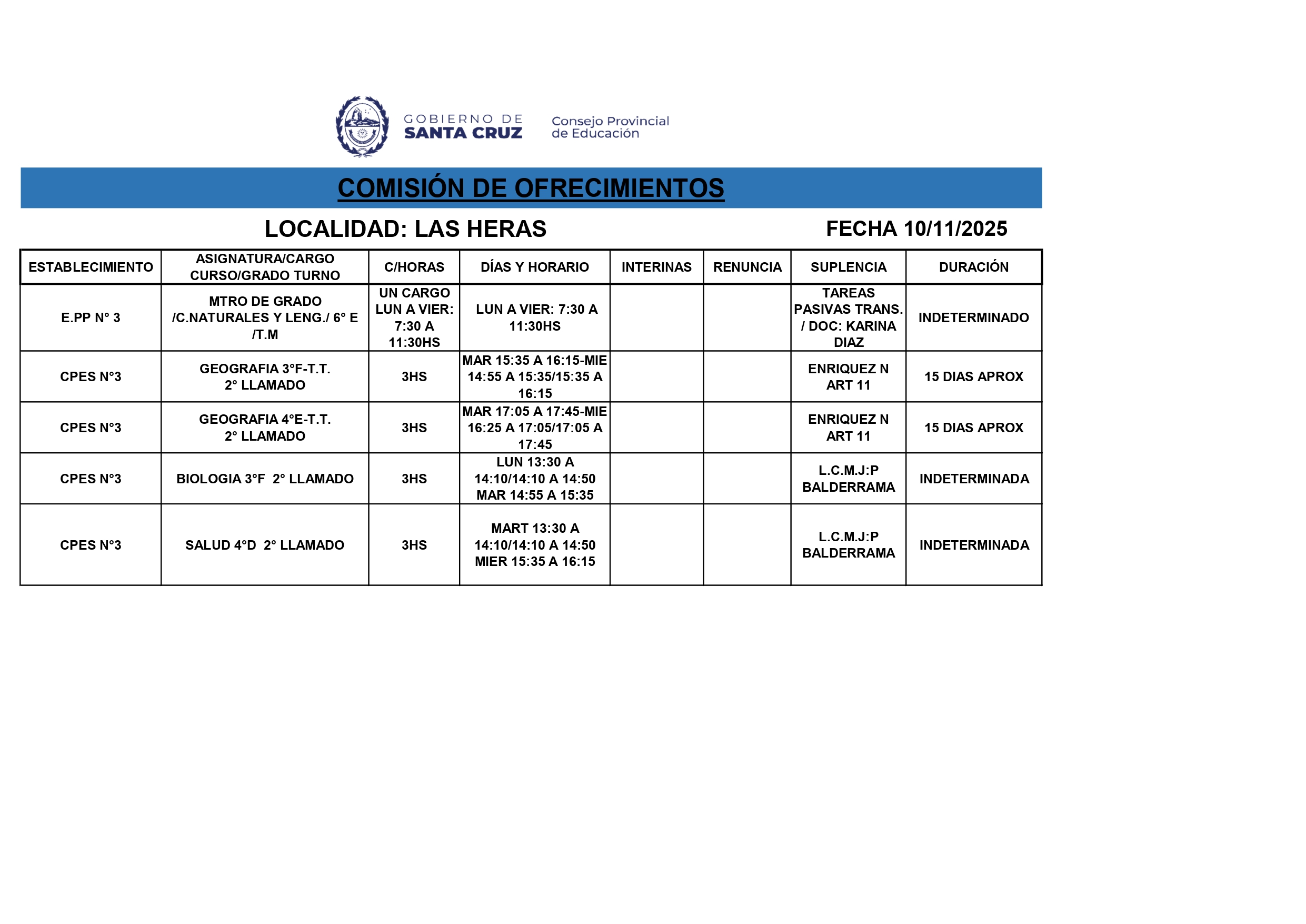 11/11/2025 | El Consejo Provincial de Educación, a través de las Comisiones de Ofrecimientos, informa que se encuentran disponibles los listados para acceder a los cargos y horas cátedra en establecimientos de diferentes localidades. Los mismos se realizarán de manera presencial.
