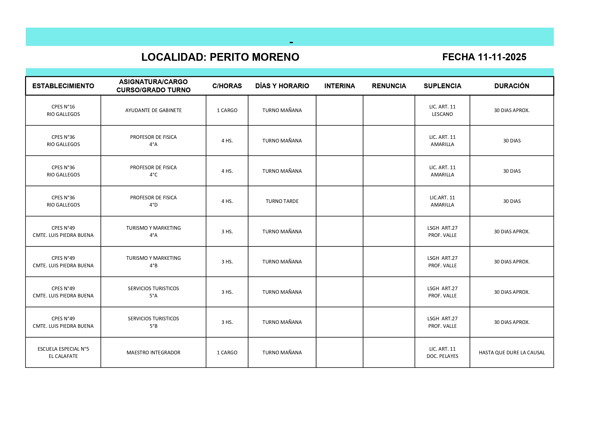 11/11/2025 | El Consejo Provincial de Educación, a través de las Comisiones de Ofrecimientos, informa que se encuentran disponibles los listados para acceder a los cargos y horas cátedra en establecimientos de diferentes localidades. Los mismos se realizarán de manera presencial.
