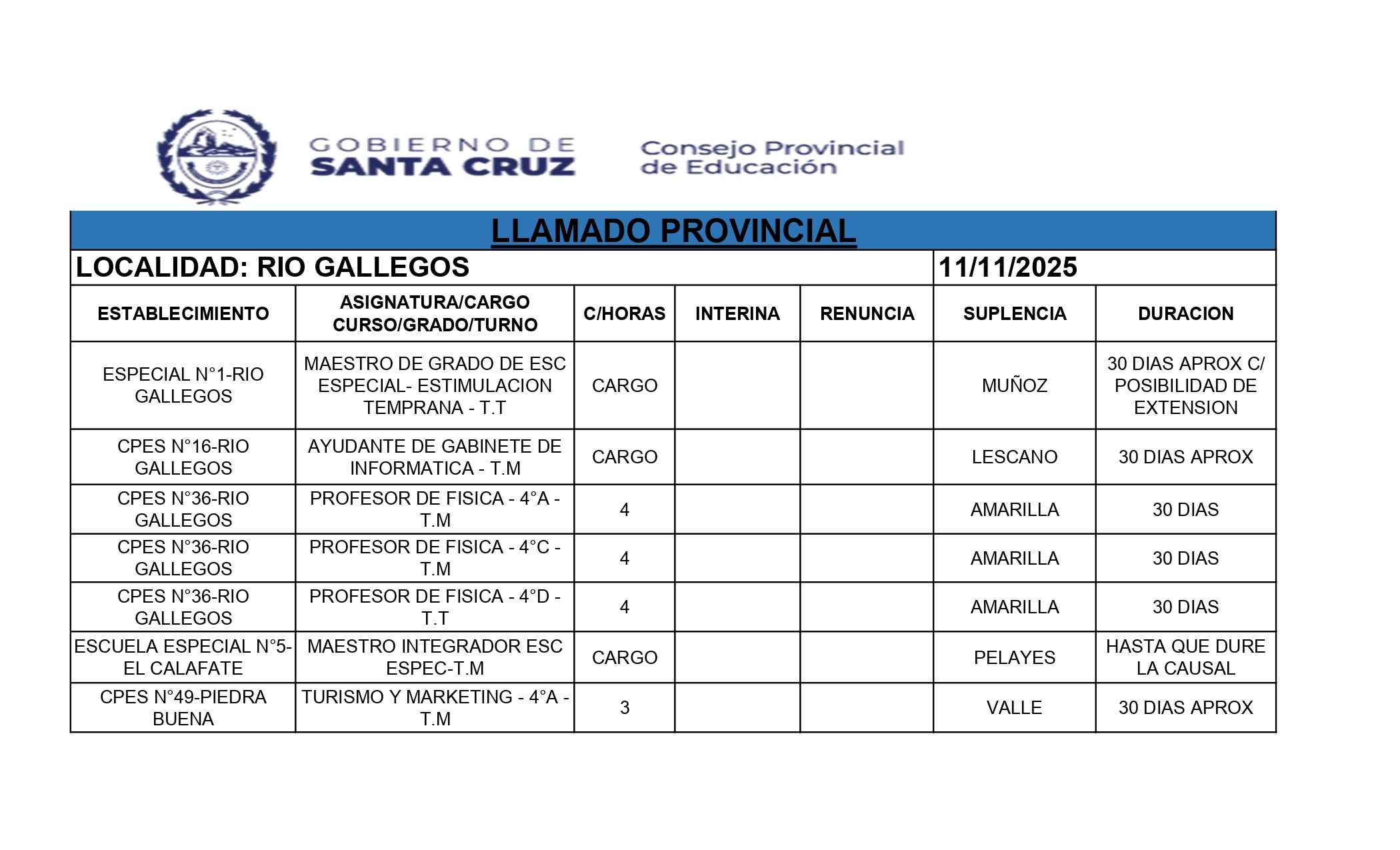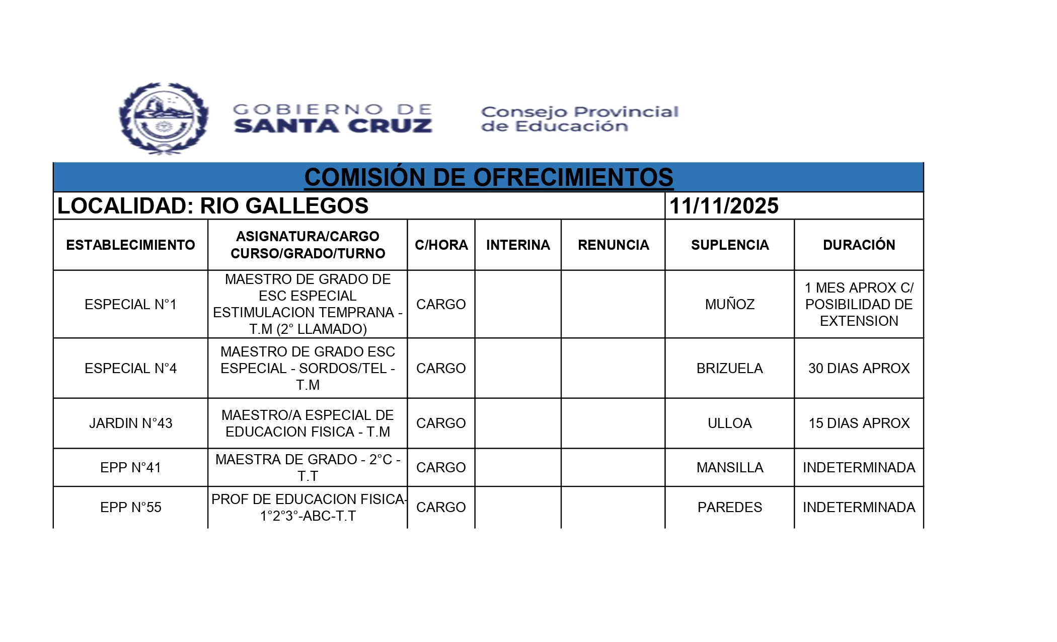 11/11/2025 | El Consejo Provincial de Educación, a través de las Comisiones de Ofrecimientos, informa que se encuentran disponibles los listados para acceder a los cargos y horas cátedra en establecimientos de diferentes localidades. Los mismos se realizarán de manera presencial.
