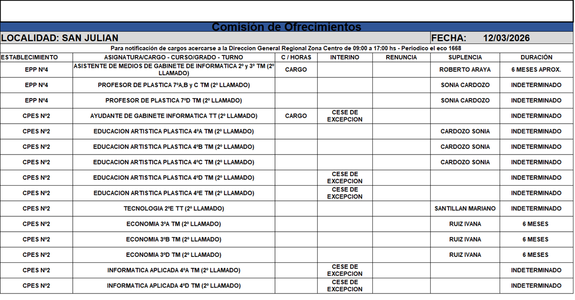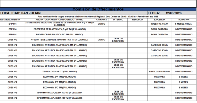 12/03/2026 | El Consejo Provincial de Educación, a través de las Comisiones de Ofrecimientos, informa que se encuentran disponibles los listados para acceder a los cargos y horas cátedra en establecimientos de diferentes localidades. Los mismos se realizarán de manera presencial.