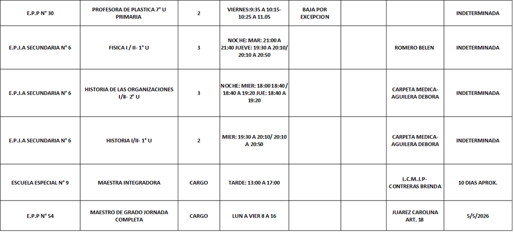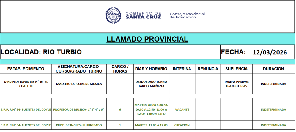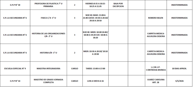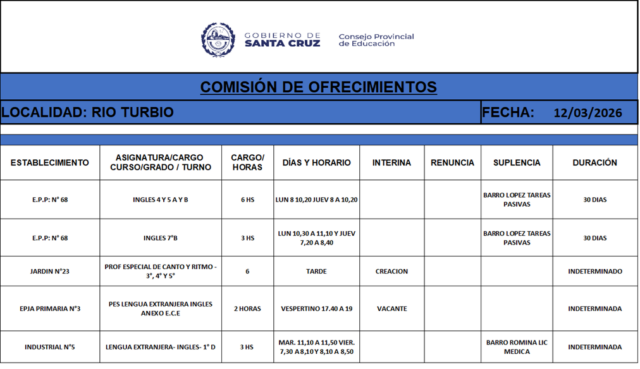 12/03/2026 | El Consejo Provincial de Educación, a través de las Comisiones de Ofrecimientos, informa que se encuentran disponibles los listados para acceder a los cargos y horas cátedra en establecimientos de diferentes localidades. Los mismos se realizarán de manera presencial.