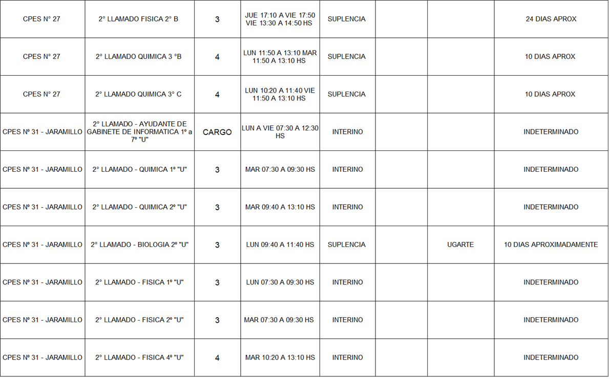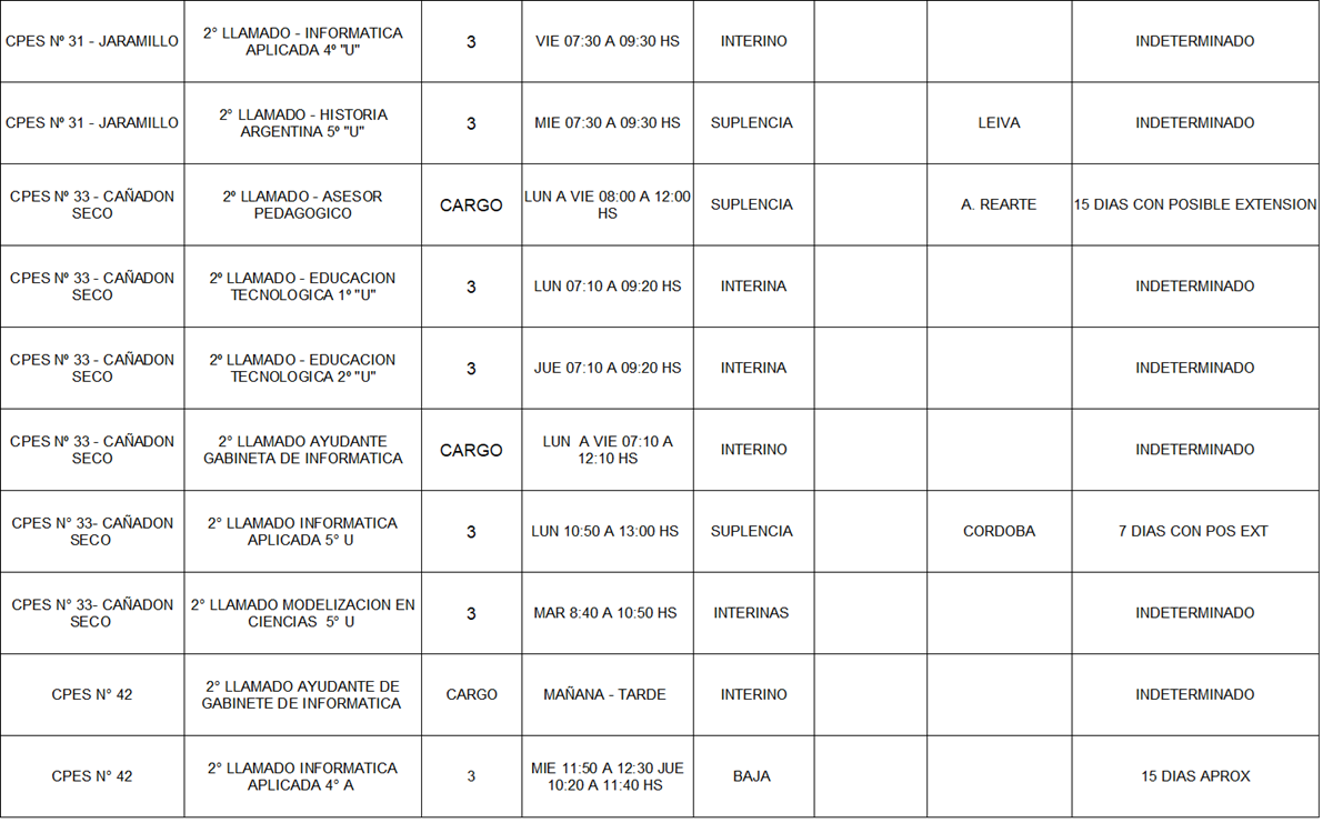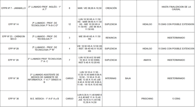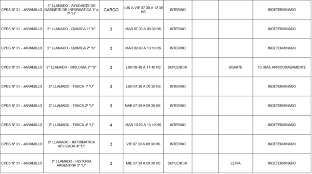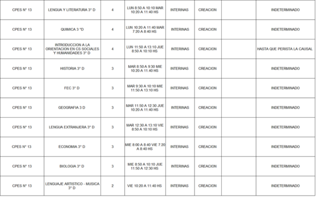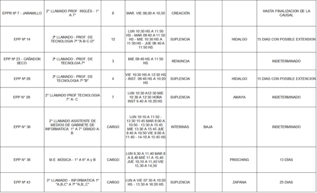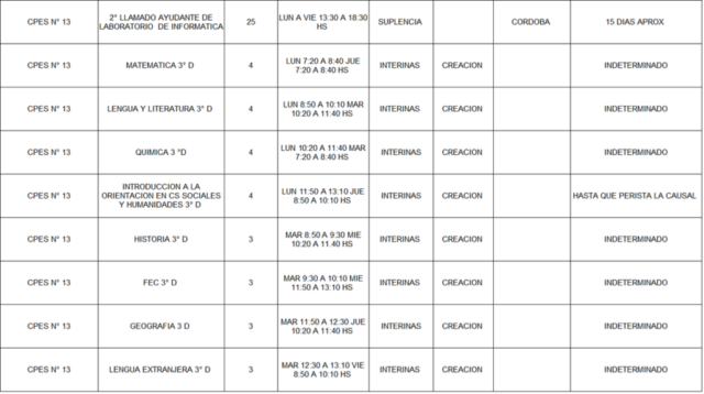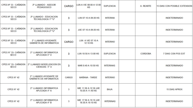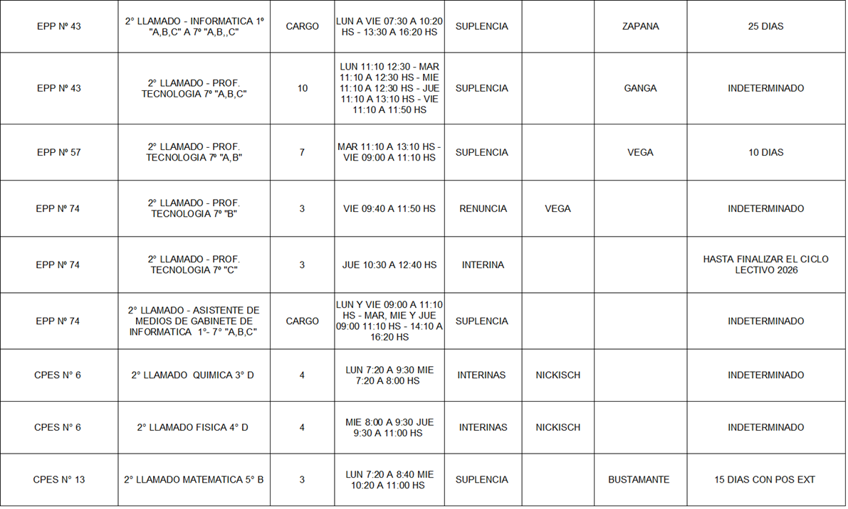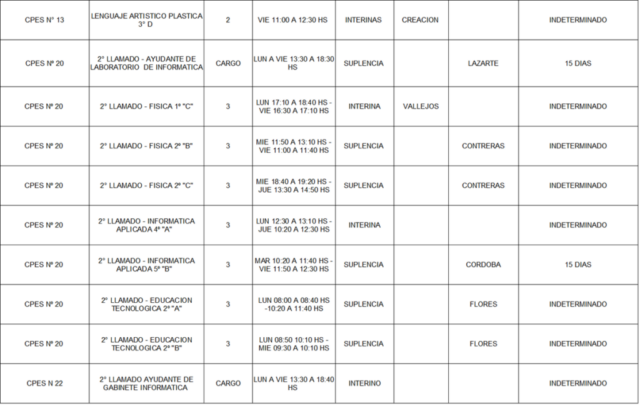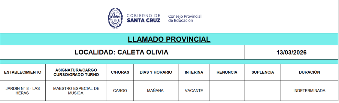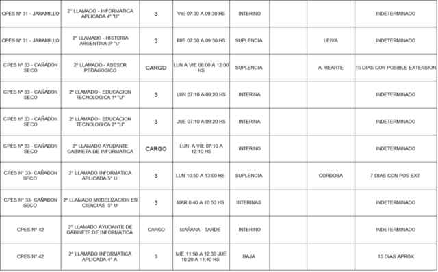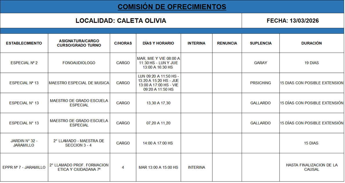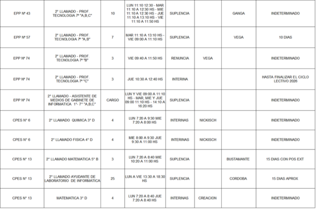 13/03/2026 | El Consejo Provincial de Educación, a través de las Comisiones de Ofrecimientos, informa que se encuentran disponibles los listados para acceder a los cargos y horas cátedra en establecimientos de diferentes localidades. Los mismos se realizarán de manera presencial.