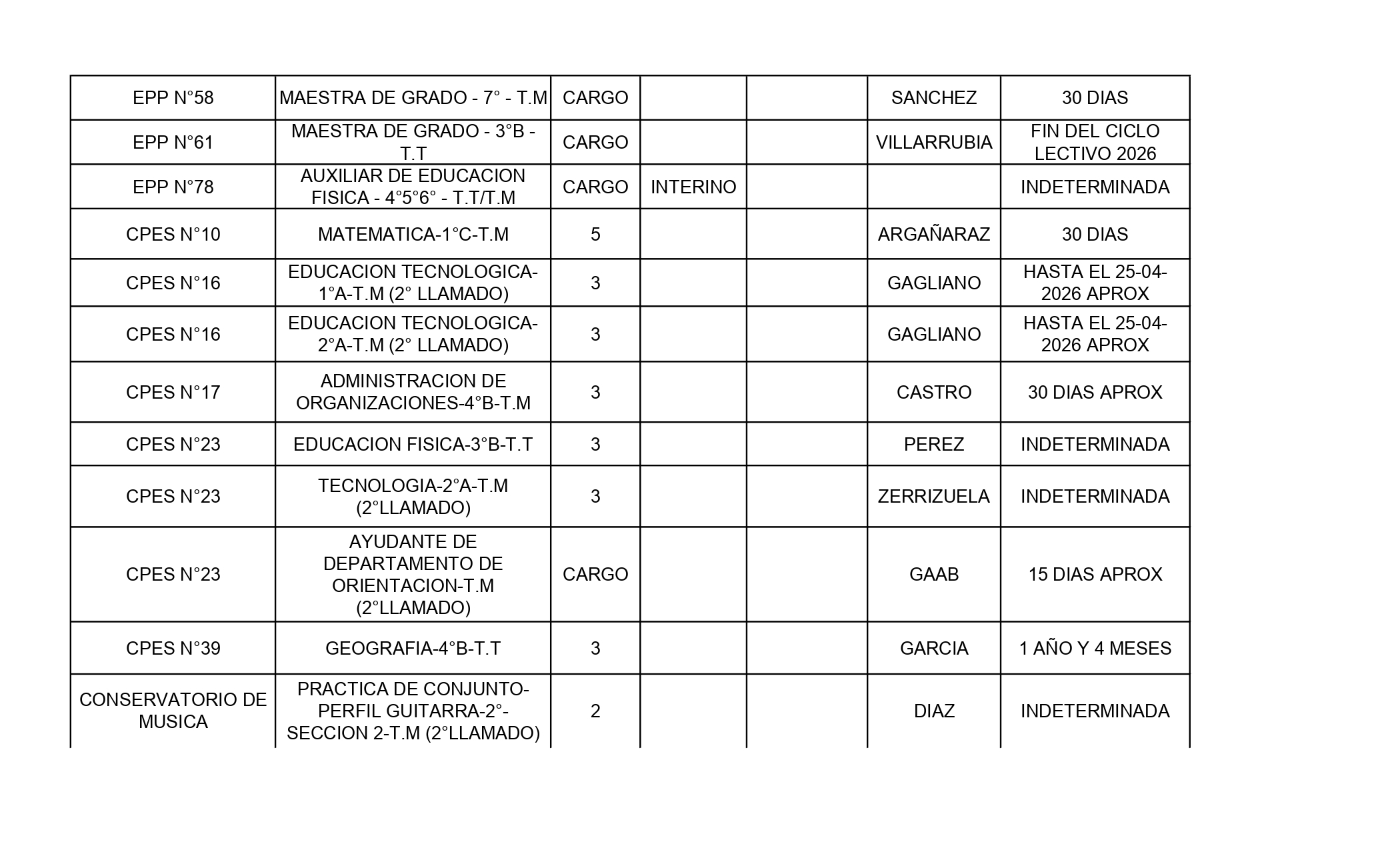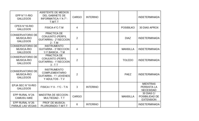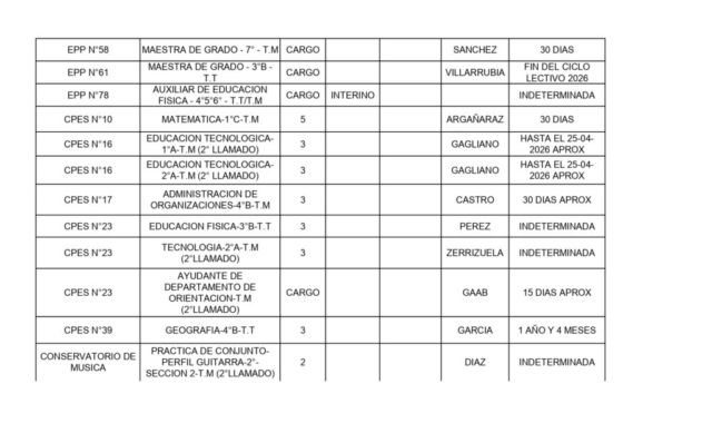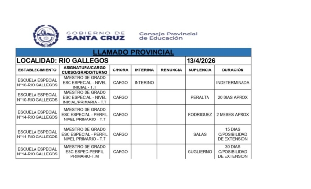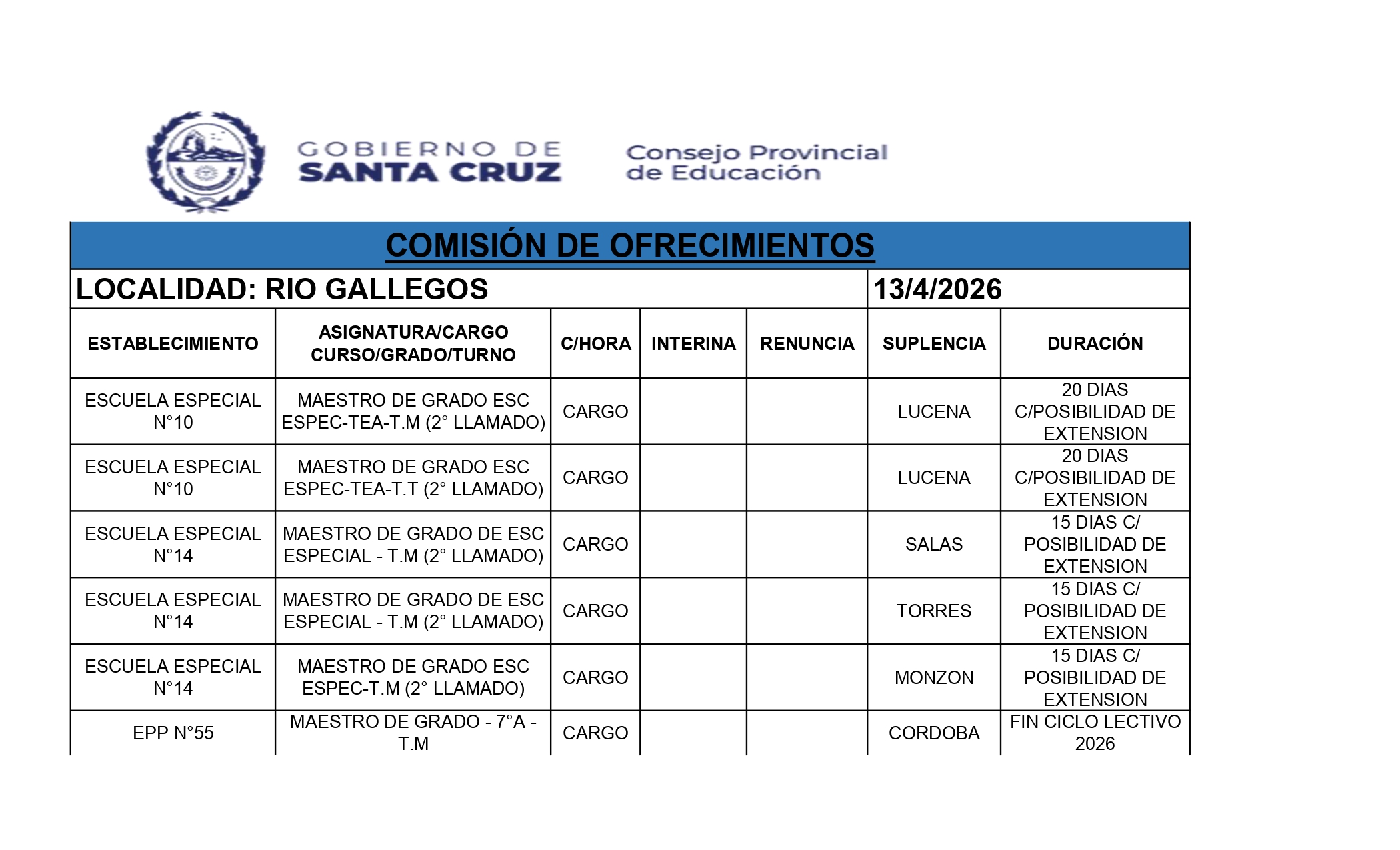 13/04/2026 | El Consejo Provincial de Educación, a través de las Comisiones de Ofrecimientos, informa que se encuentran disponibles los listados para acceder a los cargos y horas cátedra en establecimientos de diferentes localidades. Los mismos se realizarán de manera presencial.