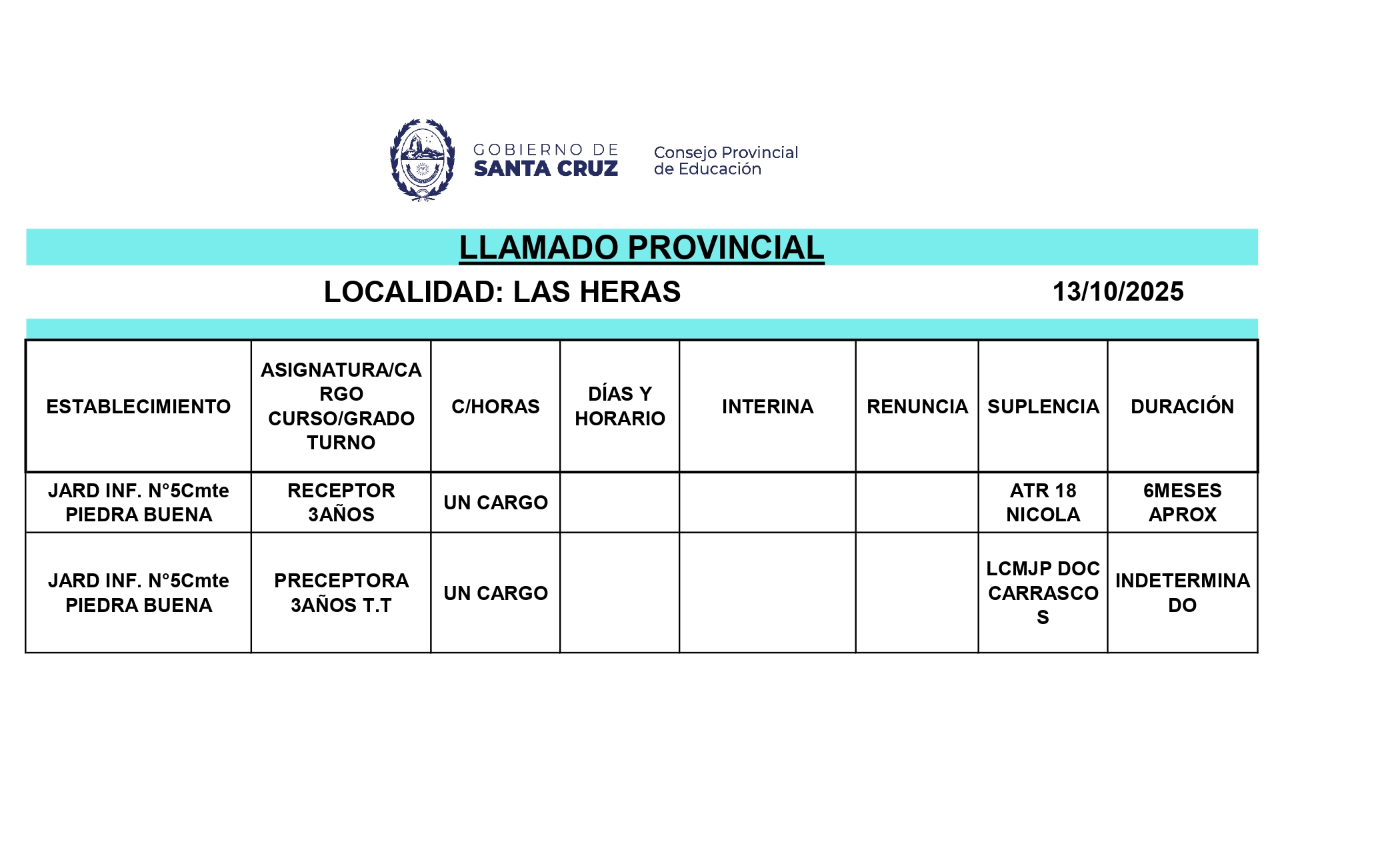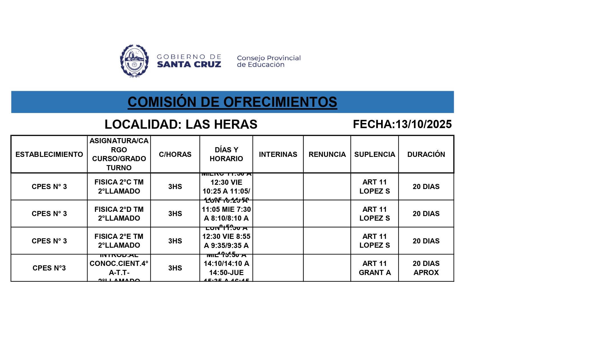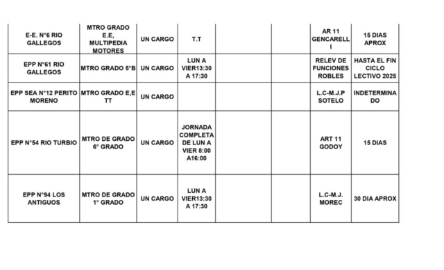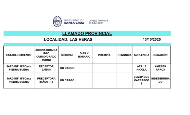 13/10/2025 | El Consejo Provincial de Educación, a través de las Comisiones de Ofrecimientos, informa que se encuentran disponibles los listados para acceder a los cargos y horas cátedra en establecimientos de diferentes localidades. Los mismos se realizarán de manera presencial.