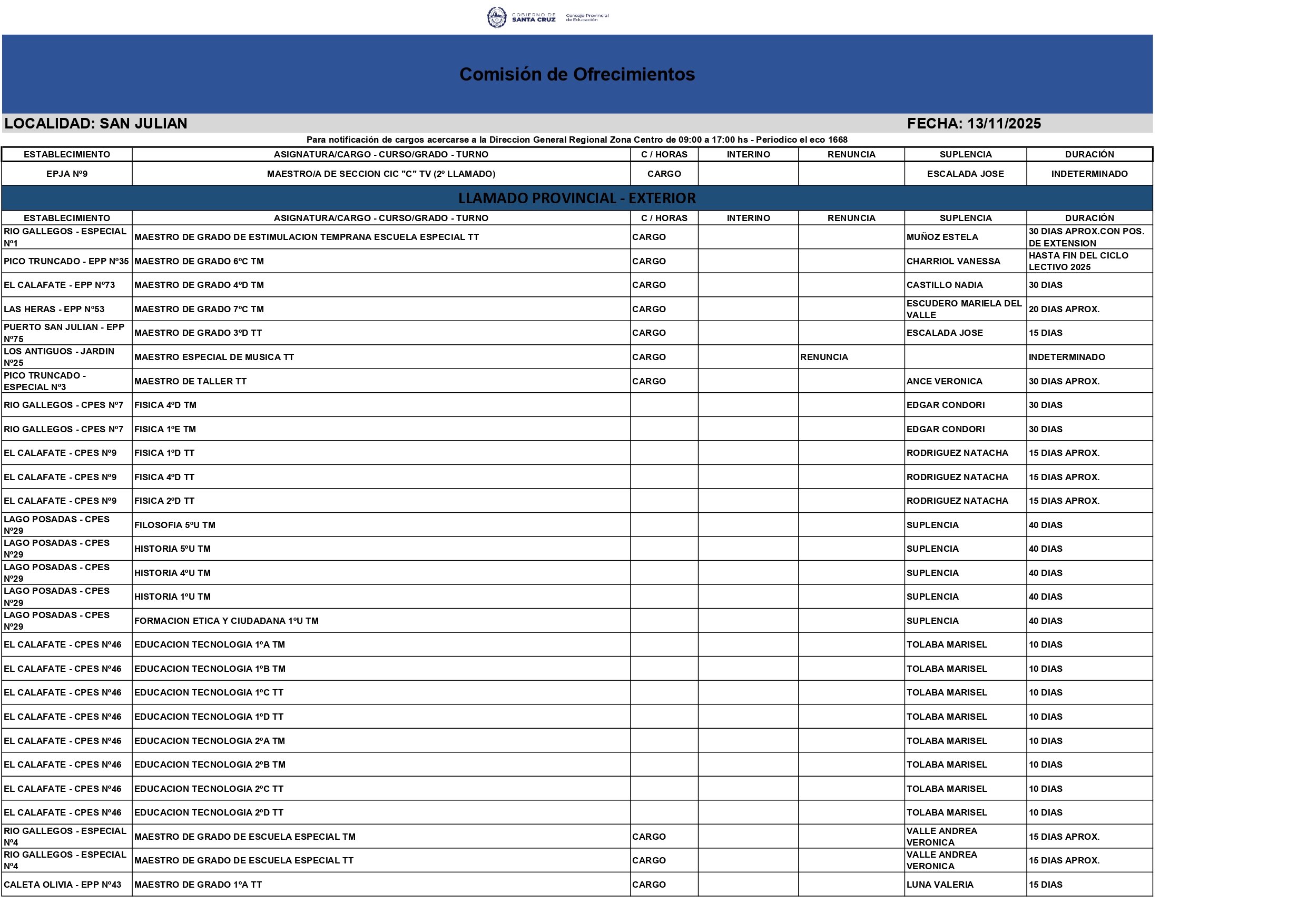 13/11/2025 | El Consejo Provincial de Educación, a través de las Comisiones de Ofrecimientos, informa que se encuentran disponibles los listados para acceder a los cargos y horas cátedra en establecimientos de diferentes localidades. Los mismos se realizarán de manera presencial.