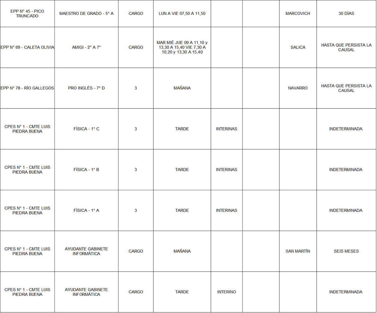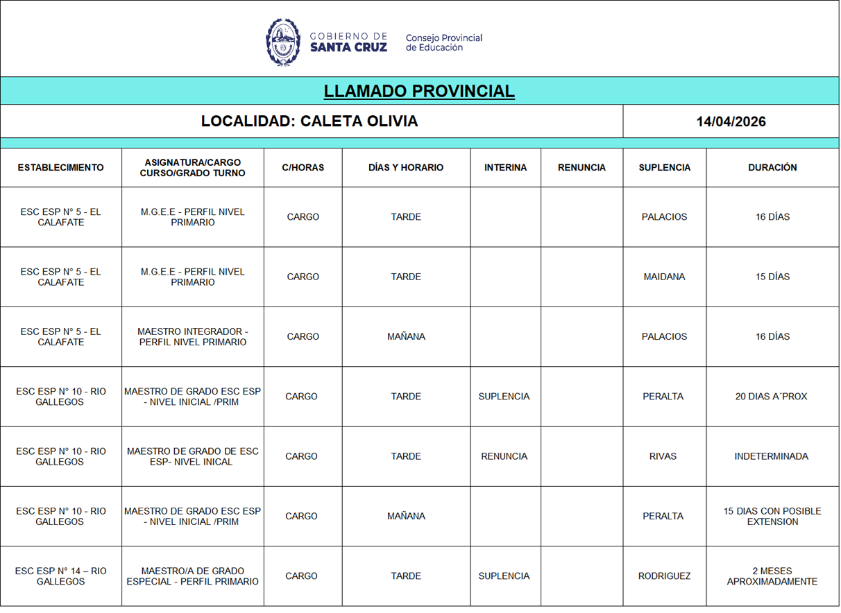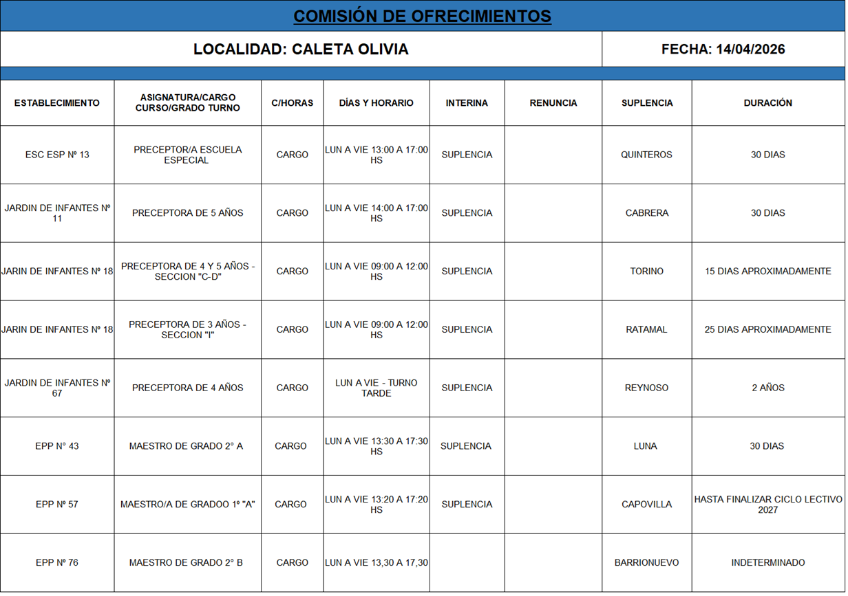 14/04/2026 | El Consejo Provincial de Educación, a través de las Comisiones de Ofrecimientos, informa que se encuentran disponibles los listados para acceder a los cargos y horas cátedra en establecimientos de diferentes localidades. Los mismos se realizarán de manera presencial.