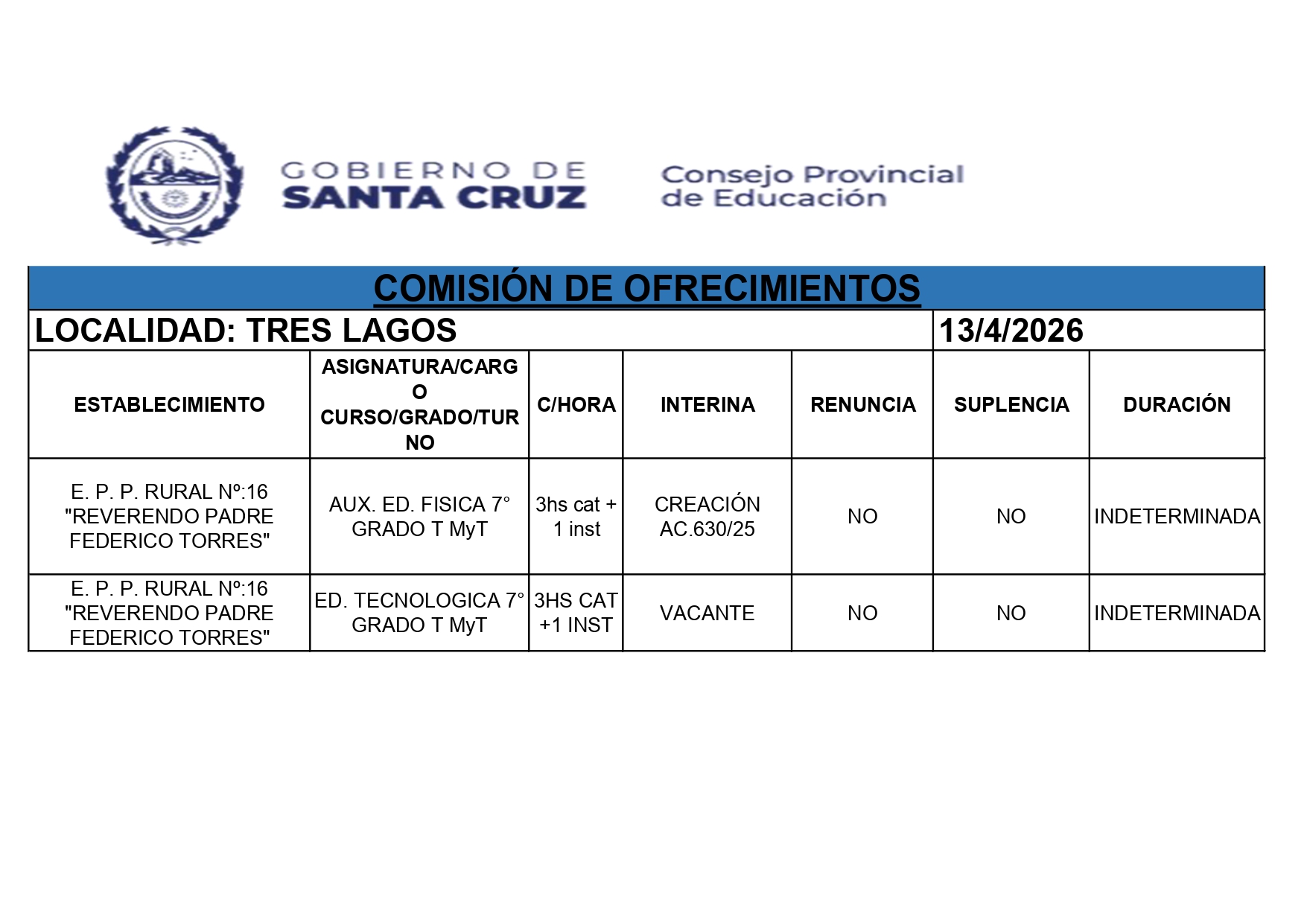 14/04/2026 | El Consejo Provincial de Educación, a través de las Comisiones de Ofrecimientos, informa que se encuentran disponibles los listados para acceder a los cargos y horas cátedra en establecimientos de diferentes localidades. Los mismos se realizarán de manera presencial.